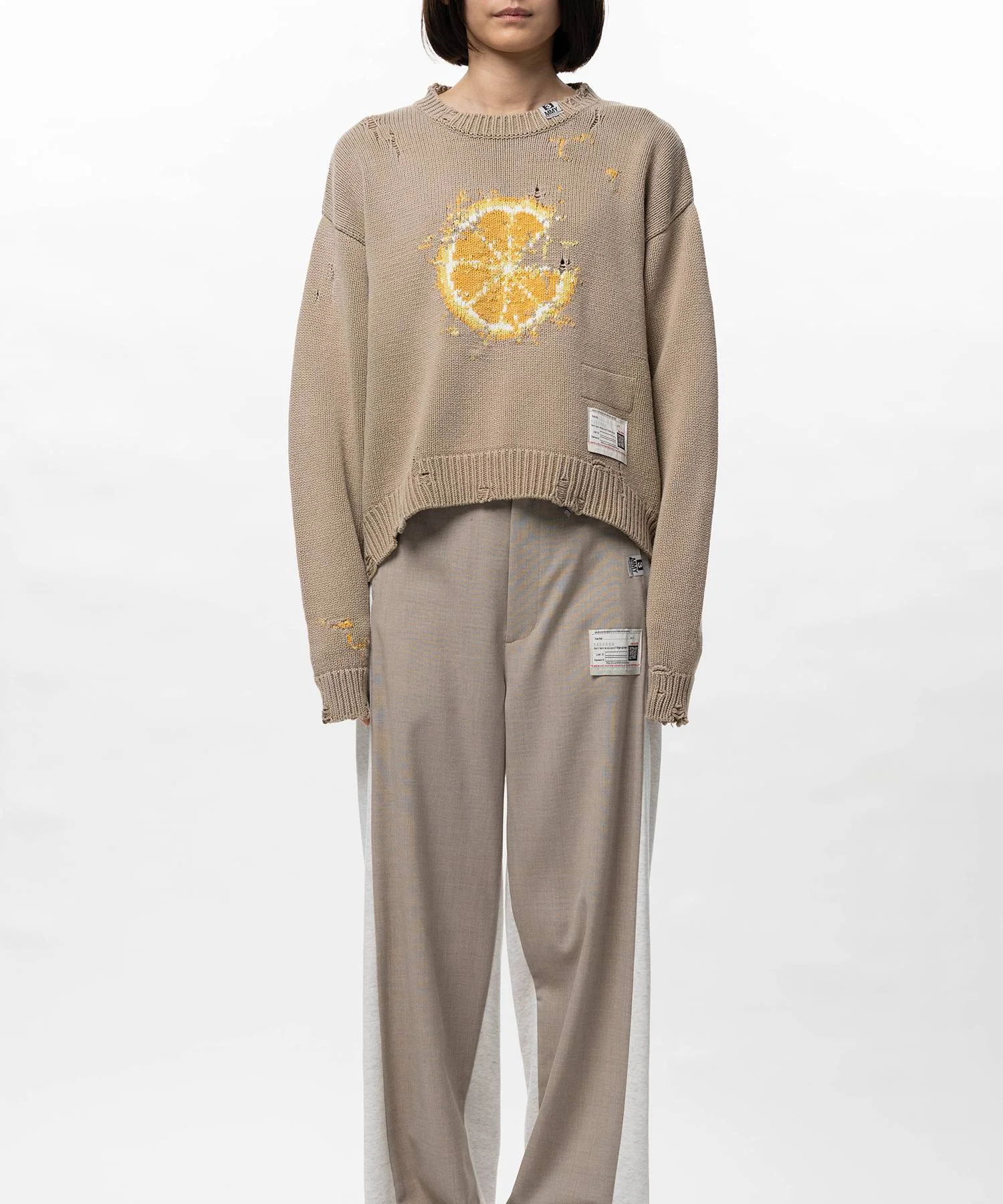 【2026 Spring /Summer Collection】 Orange Jacquard Knit Sweater A jacquard knit sweater featuring an orange motif woven prominently throughout. The hem and cuffs are designed to look as if the knit has frayed. The entire piece has been distressed. Crew neck. Wearing model : 175cm Wearing size : 38 ※Product images may appear different from the actual item due to lighting conditions during photography or variations in monitor settings. ※Some photos feature sample items; actual products may differ slightly in finish or sizing. ※Color, texture, and specifications may vary slightly due to differences in production timing or individual characteristics of each piece. We appreciate your understanding. ※Intentional distressing such as holes, fading, and staining is part of the design and reflects the character of the item. Please enjoy these features as part of its unique aesthetic. - Item No: B16SW512 - Brand: Maison MIHARA YASUHIRO - Category: WOMENS » TOPS » KNIT - Season: 2026 S/S - Material: Cotton60%,Acrylic40% - Made In: CHINA