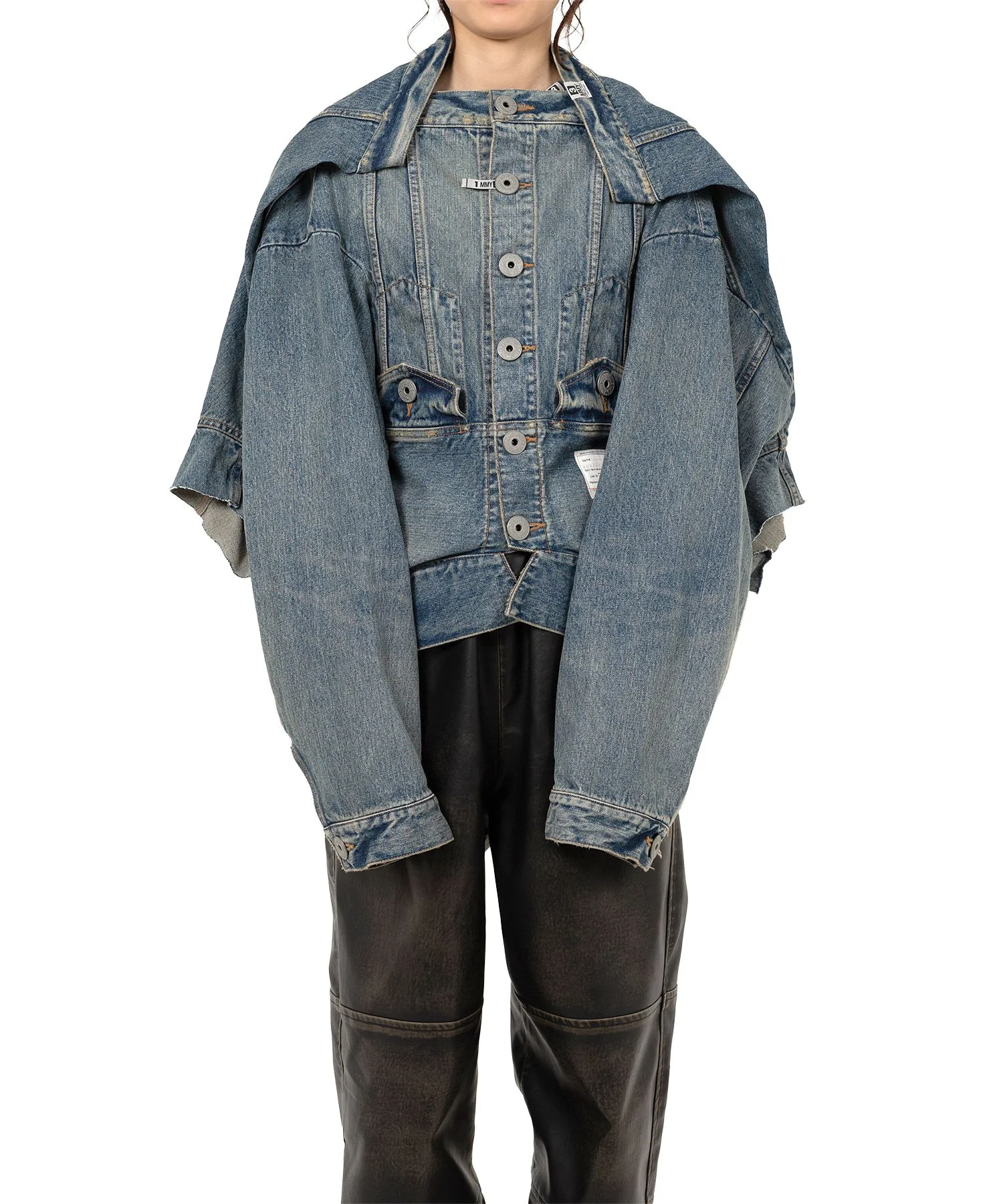 【2025 Autumn/Winter Collection】 Reversed Front Denim Jacket A denim jacket with the front flipped upside down. The hemline is placed at the collar and the breast pocket at the hem, creating an appealing visual discrepancy. The fabric has a vintage-like finish. Button-up. Wearing model : 172cm Wearing size : 40 ※Product images may appear different from the actual item due to lighting conditions during photography or variations in monitor settings. ※Some photos feature sample items; actual products may differ slightly in finish or sizing. ※Color, texture, and specifications may vary slightly due to differences in production timing or individual characteristics of each piece. We appreciate your understanding. ※Intentional distressing such as holes, fading, and staining is part of the design and reflects the character of the item. Please enjoy these features as part of its unique aesthetic. ※Product images may appear different from the actual item due to lighting conditions during photography or variations in monitor settings. ※Some photos feature sample items; actual products may differ slightly in finish or sizing. ※Color, texture, and specifications may vary slightly due to differences in production timing or individual characteristics of each piece. We appreciate your understanding. - Item No: B15BL071 - Brand: Maison MIHARA YASUHIRO - Category: WOMENS » OUTER » BLOUSON - Season: 2025 A/W - Material: COTTON 100% - Made In: JAPAN