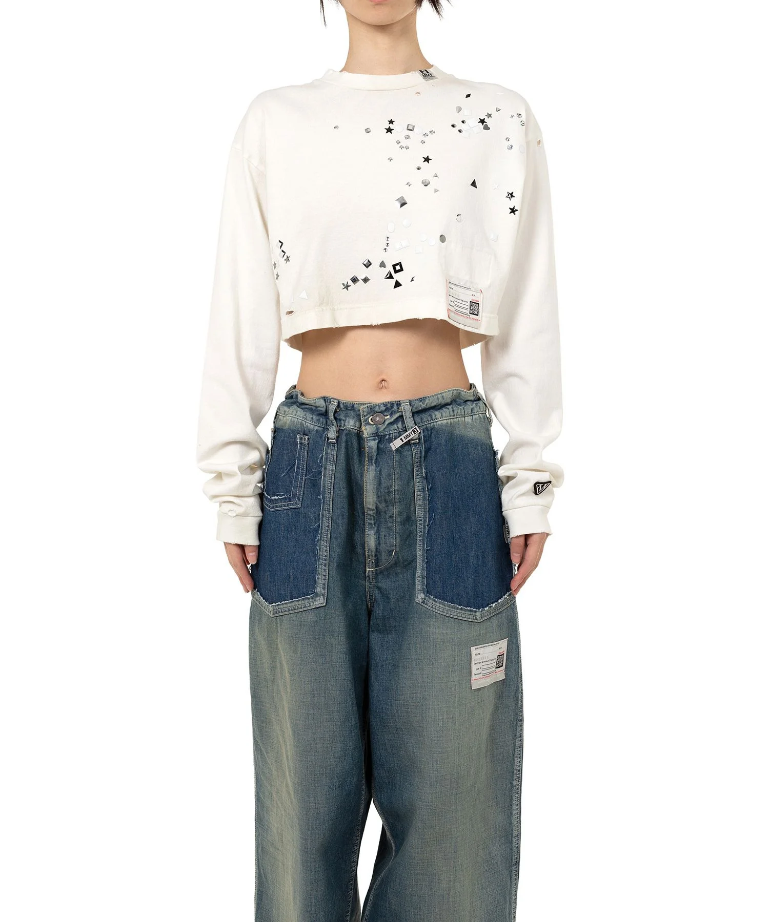 【2025 Autumn/Winter Collection】 Embellished Cropped Long Sleeve T-shirt Damaged, rhinestone embellished design. Crew neck. Crop length. Wearing model : 175cm Wearing size : 38 ※Product images may appear different from the actual item due to lighting conditions during photography or variations in monitor settings. ※Some photos feature sample items; actual products may differ slightly in finish or sizing. ※Color, texture, and specifications may vary slightly due to differences in production timing or individual characteristics of each piece. We appreciate your understanding. - Item No: B15LT611 - Brand: Maison MIHARA YASUHIRO - Category: WOMENS » TOPS » TSHIRTS - Season: 2025 A/W - Material: COTTON 100% - Made In: JAPAN
