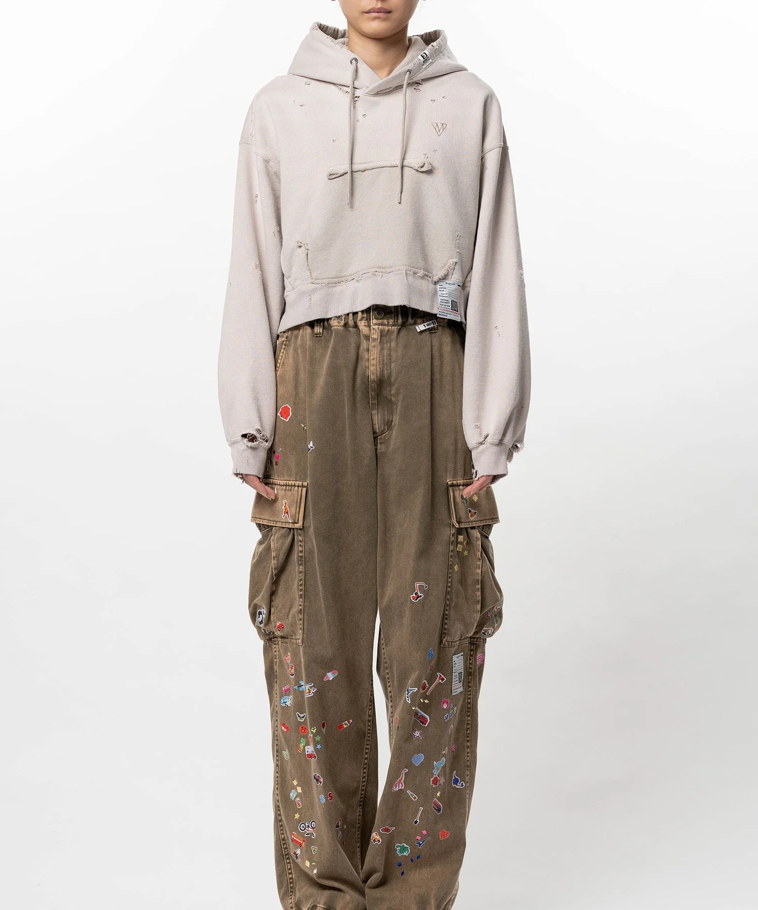 【2026 Spring /Summer Collection】 Sun Faded Like Hoodie A hoodie featuring a design with a torn-off front pocket. Bleached and distressed to create fabric that looks sun-faded with age. Original brand logo embroidered on the left chest. Short length. *The perforated damage visible throughout is part of the design. Wearing model : 175cm Wearing size : 38 ※Product images may appear different from the actual item due to lighting conditions during photography or variations in monitor settings. ※Some photos feature sample items; actual products may differ slightly in finish or sizing. ※Color, texture, and specifications may vary slightly due to differences in production timing or individual characteristics of each piece. We appreciate your understanding. ※Intentional distressing such as holes, fading, and staining is part of the design and reflects the character of the item. Please enjoy these features as part of its unique aesthetic. - Item No: K16HD721 - Brand: Maison MIHARA YASUHIRO - Category: WOMENS » TOPS » SWEATSHIRTS - Season: 2026 S/S - Material: Cotton100% - Made In: JAPAN