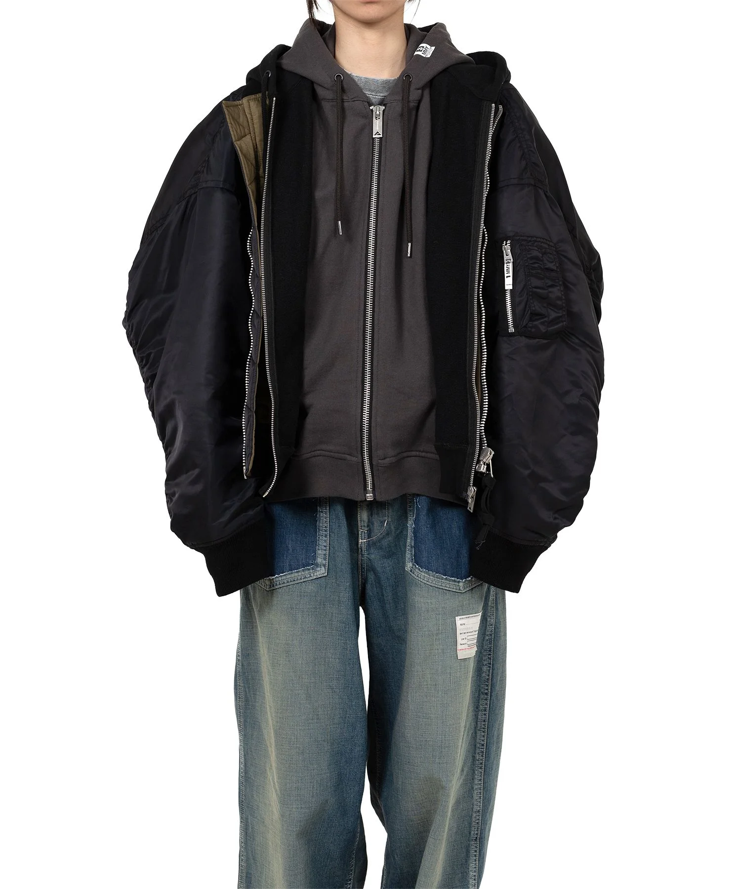 【2025 Autumn/Winter Collection】 Triple Layered Flight Jacket Three-layer construction with two different colored hoodies layered on top of each other, plus a flight jacket. Zip-up. Side pockets. Wide silhouette. Wearing model : 175cm Wearing size : 40 ※Product images may appear different from the actual item due to lighting conditions during photography or variations in monitor settings. ※Some photos feature sample items; actual products may differ slightly in finish or sizing. ※Color, texture, and specifications may vary slightly due to differences in production timing or individual characteristics of each piece. We appreciate your understanding. ※Intentional distressing such as holes, fading, and staining is part of the design and reflects the character of the item. Please enjoy these features as part of its unique aesthetic. - Item No: K15BL331 - Brand: Maison MIHARA YASUHIRO - Category: WOMENS » OUTER » BLOUSON - Season: 2025 A/W - Material: NYLON 100% - Made In: CHINA