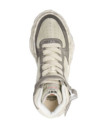 Wayne Brushed suede high-top sneakers Wayne Brushed suede high-top sneakers from MAISON MIHARA YASUHIRO featuring light beige, grey, calf leather, suede, embroidered logo, logo patch at the tongue, perforated detailing, contrasting branded heel counter, round toe, front lace-up fastening, front touch-strap fastening and chunky rubber sole. When buying this unisex item, keep in mind that it is graded in standard men's sizing.. Imported Composition Leather 100% SIZE & FIT Measurement HEEL 1.57 in(4 cm) Sole height 1.18 in(3 cm) Washing instructions Do Not Wash/Do Not Dry Clean