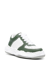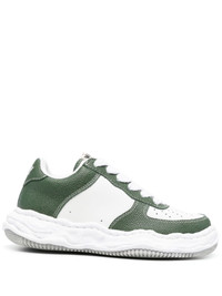 Wayne low-top sneakers Set atop Maison Mihara Yasuhiro's signature warped rubber outsole, these Wayne sneakers are an AW23 staple. Presented in a white and green colourway, they feature a tonal embroidered logo and perforated toebox. Highlights - White/green - Calf leather - Panelled design - Perforated toebox - Embroidered logo to the front - Logo patch at the tongue - Branded heel counter - Round toe - Front lace-up fastening - Branded insole - Chunky rubber sole Imported Composition Leather 100% SIZE & FIT Measurement HEEL 1.57 in(4 cm) Sole height 1.18 in(3 cm)