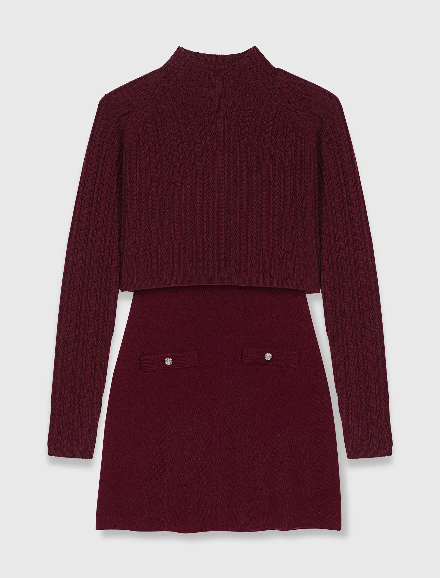 2-in-1 knit mini dress A silhouette in motion, designed as a play of contrasts for the new season. Maje introduces hybrid pieces, offering a multitude of ways to wear and styles. Crafted in a knit style, this 2-in-1 dress with sleeves reveals a sleeveless cut and a removable cable knit jumper, as well as two buttoned pockets. A structured look, adaptable to your desires, to be accessorised with a silk scarf and leather pieces like boots and an M bag. - 2-in-1 cable knit dress - Sleeveless dress with round neck and flared skirt - Removable cropped jumper with high neck and long sleeves - Runs large, size down - A silhouette in motion, designed as a play of contrasts for the new season. Maje introduces hybrid pieces, offering a multitude of ways to wear and styles. Crafted in a knit style, this 2-in-1 dress with sleeves reveals a sleeveless cut and a removable cable knit jumper, as well as two buttoned pockets. A structured look, adaptable to your desires, to be accessorised with a silk scarf and leather pieces like boots and an M bag. The model is 5' 10 and wears a size 36. Reference: MFPRO04360_0150 Composition & care Main material: 45% acrylic, 30% polyamide, 25% wool Top: 44% acrylic, 30% polyamide, 25% wool, 1% elastane Hand wash Do not bleach Do not tumble dry Iron at a maximum temperature of 110°C without steam F - Professional dry clean, with hydrocarbon solvent, normal treatment