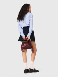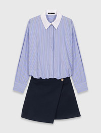 2-in-1 shirt dress A look for the metropolitan woman with a nautical spirit, who dares to break the classic preppy rules with unexpected, assertive combinations. This hybrid dress combines the spirit of a striped shirt with a modern navy blue wrap skirt. Worn on its own, the shirt dress has a loose, comfortable fit. A contrasting white collar, a large gold button on the skirt and a concealed button placket with silver buttons elevate the silhouette down to the last detail. To complete the look, pair it with a mini Miss M bag, openwork socks and patent black loafers for a fashionable, modern twist. - 2-in-1 striped shirt and wrap skirt dress - Blouson effect - Contrasting white shirt collar - Asymmetrical navy blue short skirt - Concealed button placket - Decorative gold button - Fits True to size The model is 5' 9 and wears a size FR 36. Reference: MFPRO04566_0524 Composition & care Main material: 100% cotton Collar: 100% cotton Secondary material: 55% wool, 41% polyester, 4% elastane Inner fabric: 100% polyester Hand wash Do not bleach Do not tumble dry Iron at a maximum temperature of 110°C without steam F/ - Professional dry clean, with hydrocarbon solvent, gentle treatment