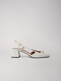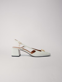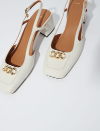 Square-toe leather pumps Enhance your silhouette with these pumps made from smooth leather, perfect to accompany you from day to night. Equipped with a wide heel, square toes and a thin adjustable strap, they reveal a Clover charm and reveal a set of links on the front. Chic and versatile, they lend themselves easily to all your occasions, casual as well as more sophisticated. - Smooth leather pumps - Square ends - Adjustable straps - Heel height: 5.5 cm Reference: MFACH00644_0101 Composition & care Lining: sheepskin Ornaments: 95% zinc, 5% copper Outer sole: cow Upper: cow Sock lining: sheepskin Band: cow Buckle: 95% zinc, 5% copper Applique: 100% rubber Do not wash Do not bleach Do not tumble dry Do not iron Do not dry clean