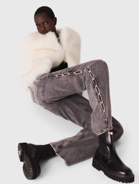 Beaded wide-leg jeans Maje stylishly reinvents wardrobe staples, infusing them with precious details and reworking the cuts to perfection. These statement jeans are revisited with cutouts on the sides and an original detail. Pearly beads are revealed, elevating this must-have piece. Complete the look with a faux fur jacket and the season's key accessories: a fringed bag and leather boots. - Faded wide-leg denim jeans - Cutaway sides embellished with beads - Straight fit and signature jacron on the back - Designed for a standard fit The model is 5' 10 and wears a size 36. Reference: MFPJE00770_0505 Composition & care Main material: 99% cotton, 1% elastane Pocket lining: 67% polyester, 33% cotton Jacron: calfskin leather Regular cycle 30° Do not bleach Do not tumble dry Iron at a maximum temperature of 110°C without steam Do not dry clean