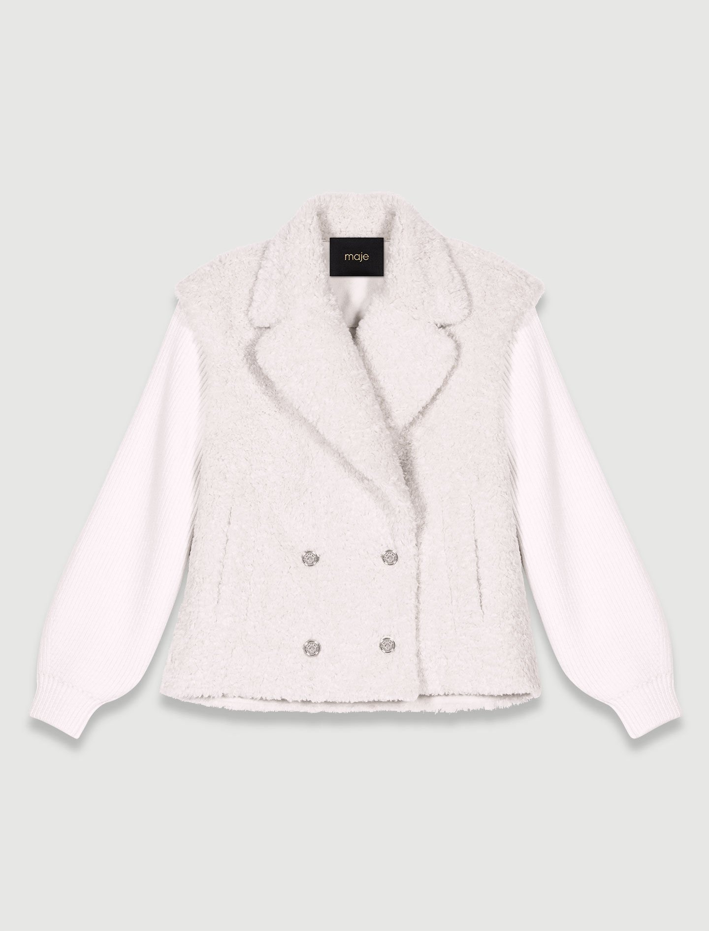 Two-material jacket For the new collection, the studio has come up with a versatile wardrobe with a lightweight feel, boldly interplaying contrasts and feminine details. Combining softness, elegance and comfort, this dual-material jacket has a subtle interplay of illusion effects to structure your look. Made from shearling-effect faux fur, it features long rib-knit sleeves, two pockets and a double-breasted design embellished with a Clover logo. - Mix and match knit and faux fur shearling effect jacket - Rib knit sleeves - 2 pockets The model is 5' 11 and wears a size 36. Reference: MFPBL00703_0130 Composition & care Main material: 100% polyester Sleeves: 59% acrylic, 29% polyamide, 12% wool Pocket: 100% polyester Regular cycle 30° Do not bleach Do not tumble dry Iron at a maximum temperature of 110°C without steam F - Professional dry clean, with hydrocarbon solvent, normal treatment