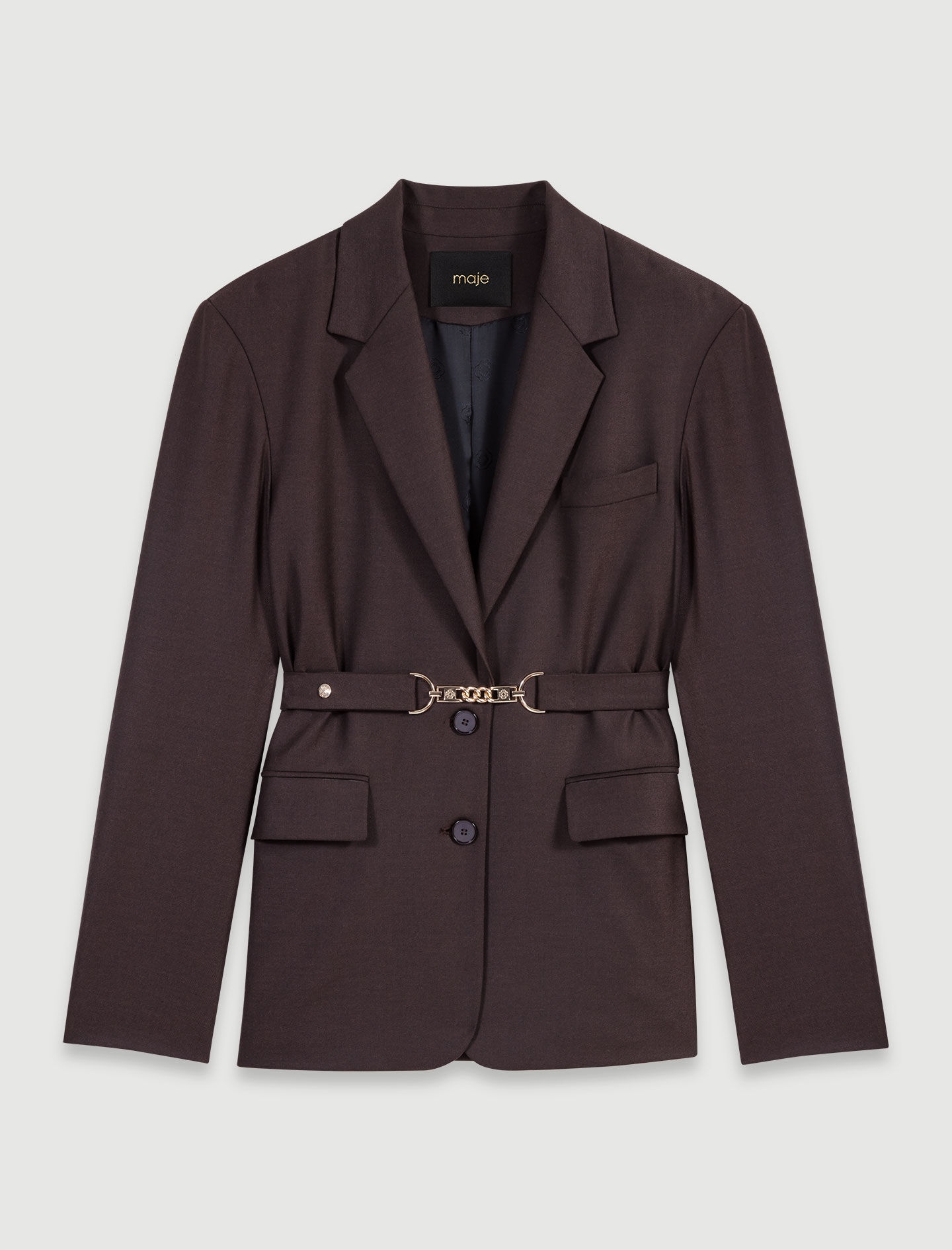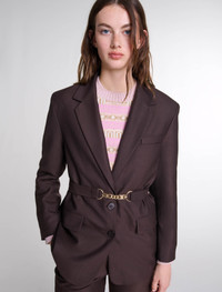 Belted suit jacket The studio unveils its new collection, the epitome of Parisian chic. Elegance and sophistication unite in a subtle interplay of contrasts and proportions, giving your looks a confident, modern edge. The waist is discreetly accentuated on this long-sleeved suit jacket with lapel collar. Both chic and structured, it features a removable belt with curb chain links – this season's hottest accessory. Add matching trousers for an elegant silhouette, and set off with slingback pumps. - Fitted suit jacket - Removable curb chain belt - Long sleeves with buttoned cuffs The model is 5' 10 and wears a size 36. Reference: MFPVE00614_G005 Composition & care Main fabric: 52% polyester, 26% wool, 18% viscose, 4% elastane Lining: 100% viscose Do not wash Do not bleach Do not tumble dry Iron at a maximum temperature of 110°C without steam F - Professional dry clean, with hydrocarbon solvent, normal treatment