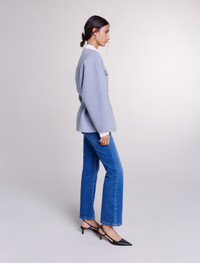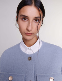 Belted short coat This season, timeless pieces get a new twist with pastel shades, a feminine touch and bold shapes to elegantly complement your looks. This cropped coat, crafted from a double-breasted wool blend, adopts the season's flagship colour to brighten up your overall style. Featuring a round collar and long sleeves, it has a zip, two chest pockets with flaps and two side pockets embellished with engraved press studs. The epitome of effortless chic, it can be worn loosely or snugly thanks to its buckle belt. - Wool blend coat - Belt with buckle - Engraved press studs The model is 5' 9 and wears a size 36. Reference: MFPOU01197_0201 Composition & care Main fabric: 79% wool, 21% polyamide Do not wash Do not bleach Do not tumble dry Iron at a maximum temperature of 110°C without steam F/ - Professional dry clean, with hydrocarbon solvent, gentle treatment