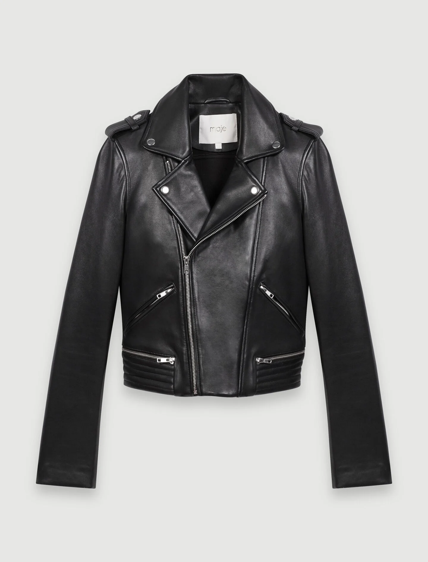 Leather biker-style jacket Leather biker-style jacket with turn down collar and snaps. Long sleeves, buttoned shoulder straps and multi-zipped side pockets. Slim fit, finished with an asymmetrical zipper closure and angled hem. - Leather Jacket The model is 5' 10 and wears a size 36. Reference: MFPBL00588_2517 Composition & care Main material: lambskin leather Lining: 60% cotton, 40% polyester Do not wash Do not bleach Do not tumble dry Do not iron Do not dry clean
