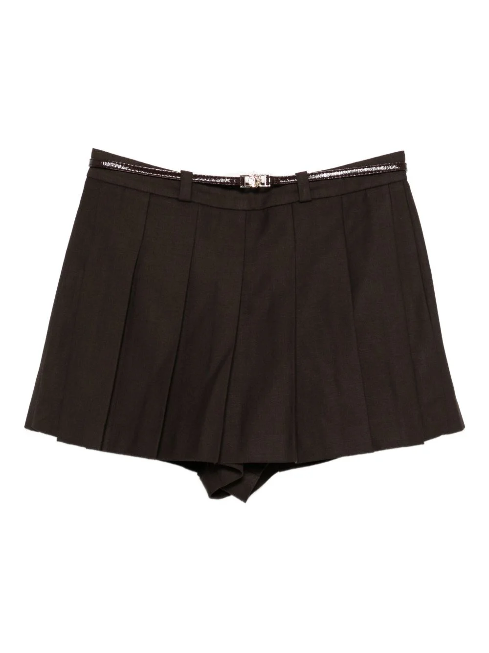 belted pleated skorts Highlights - Brown - Belted waist - Front buckle fastening - Fully pleated - Thigh length - Belt loops Imported Composition Outer: Polyester 52%, Wool 26%, Viscose 18%, Elastane 4% Lining: Viscose 100% Washing instructions Read Manufacturer Guidelines