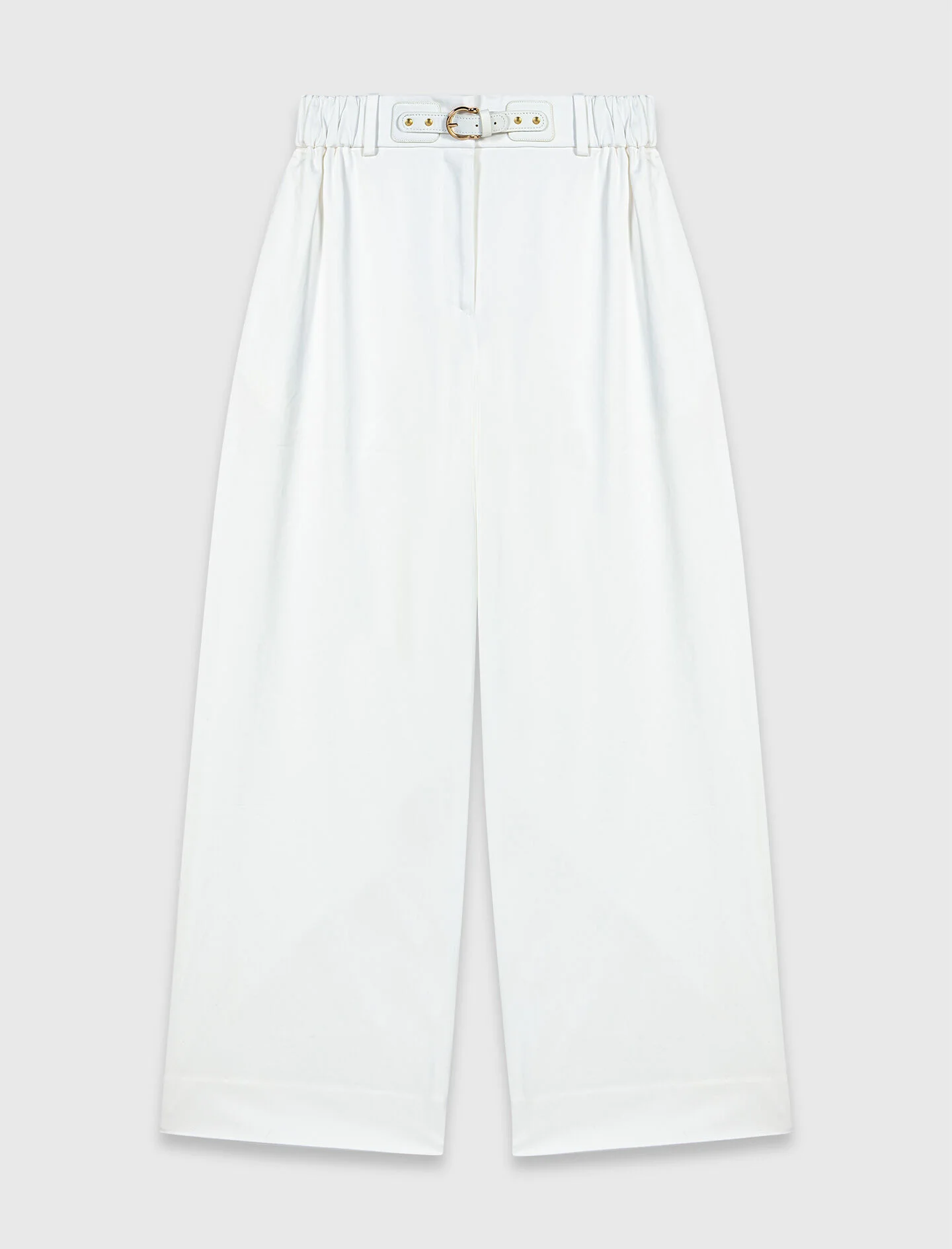 Wide-leg cotton trousers The radiant elegance of the Riviera inspires a modern look, where feminine strength is expressed through refined details and bold cuts. These wide-leg white cotton trousers flatter the figure with their gathered high waist, flat front and thin belt, accentuated by a gold metal buckle and signature rivets. The Italian pockets and tonal topstitching combine functionality and sophistication for a look that is both structured and casual. - Wide-leg cotton trousers - Paperbag-effect high waist - Adjustable belt with gold buckle - Gold rivets on the belt - Side Italian pockets and back patch pockets Reference: MFPPA00808_10 Composition & care Main material: 100% cotton Pocket lining: 100% viscose Regular cycle 30° Do not bleach Do not tumble dry Iron at a maximum temperature of 110°C without steam F/ - Professional dry clean, with hydrocarbon solvent, gentle treatment