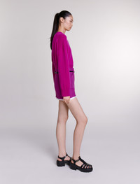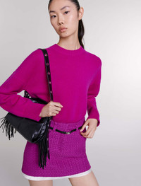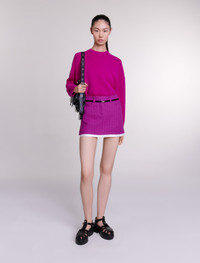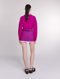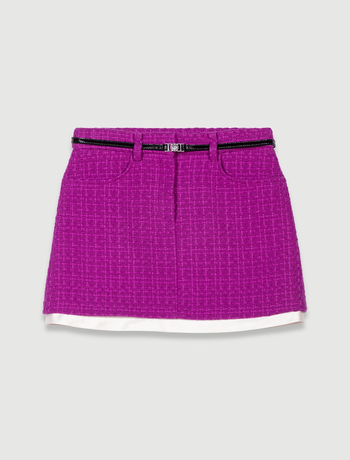 Tweed mini skirt Discover our new collection – a bold reinterpretation of Maje classics. Iconic pieces are transformed with contrast materials and careful details to enhance your looks. This short skirt puts tweed centre stage in this season's trend colour. Featuring a zip fastening and two pockets, it has a trompe l'œil design with a signature satin jacquard lining. The leather-look belt, adorned with a Clover buckle, is removable and can be adjusted at the back to accentuate your waist as much as you want. - Tweed mini skirt - Trompe l'œil design with satin jacquard lining - Removable belt with Clover buckle The model is 5' 11 and wears a size 36. Reference: MFPJU01159_F035 Composition & care Main fabric: 65% cotton, 35% polyamide Lining: 100% viscose Do not wash Do not bleach Do not tumble dry Iron at a maximum temperature of 110°C without steam F - Professional dry clean, with hydrocarbon solvent, normal treatment