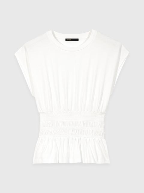 Boat print T-shirt The Maje woman draws inspiration from nautical style to reinvent her wardrobe, infusing each piece with a graphic, free-spirited and resolutely modern energy. This soft cotton, long-sleeved T-shirt charms with its boxy fit and bold printed sailboat motif, enhanced with YACHT CLUB lettering for a sporty-chic look. The colour contrast creates a preppy essential with an adventurous spirit. Pair it with a navy skirt, an M bag and boat shoes to complete the look. - Cotton T-shirt with boat print - Cropped boxy fit - Multicoloured printed sailboat motif - Printed YACHT CLUB lettering - Wide long sleeves - Ribbed round neck The model is 5' 10 and wears a size FR 1. Reference: MFPTS01007_10 Composition & care Main material: 100% cotton Rib: 100% cotton Regular cycle 30° Do not bleach Do not tumble dry Iron at a maximum temperature of 110°C without steam Do not dry clean