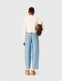 Jumper with jewelled buttons The new Maje collection explores quiet strength and assertive femininity in a timelessly chic wardrobe. This short wool jumper is captivating with its vertical rib knit that creates a close-fitting silhouette. Its delicate round neck and bow-shaped jewel detail on the back add a subtle, precious touch. Worn on its own or layered, it's a key piece for the season. Pair it with wide-leg jeans, an M Tote bag and platform boat shoes for an assertive look. - Rib knit jumper with jewel buttons on the back - 100% wool - Fitted cut - Round crew neck - Teardrop fastening on the back, bow-shaped jewel button The model is 5' 9 and wears a size FR 1. Reference: MFPPU00983_0101 Composition & care Main material: 100% wool Tab: 90% wool, 9% polyamide, 1% elastane Rib: 100% wool Hand wash Do not bleach Do not tumble dry Iron at a maximum temperature of 110°C without steam Do not dry clean