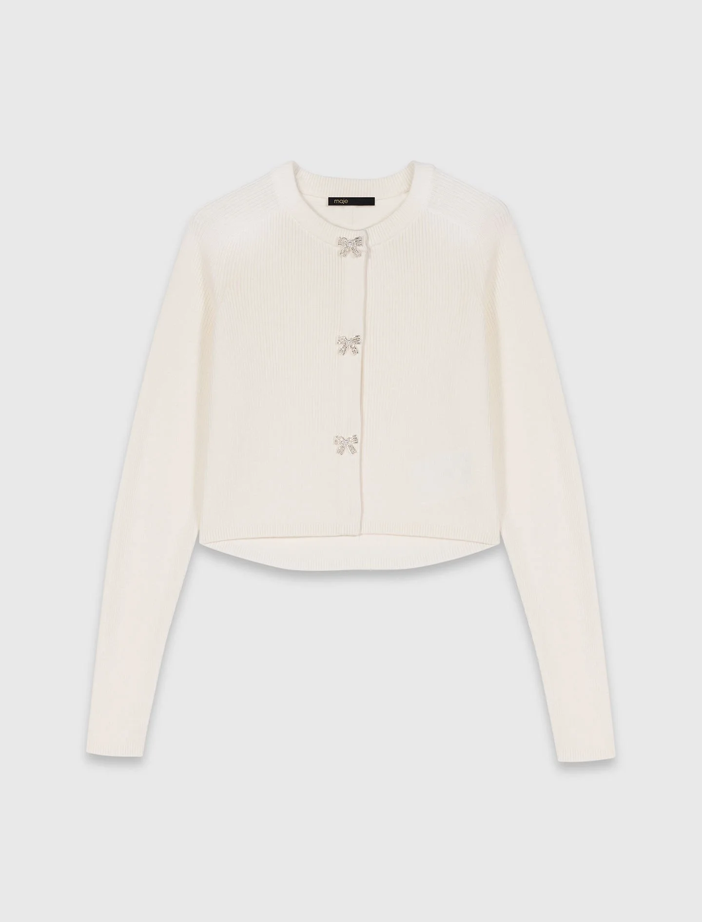 Bow jewellery button cardigan The Chinese New Year capsule collection makes a statement with rich textures and precious touches for a confident, contemporary look. This cropped wool cardigan features a vertical rib knit, raglan sleeves and a round neckline, offering a flared and comfortable fit. Three bow-shaped jewellery buttons set with silver rhinestones brighten it up and add a sophisticated touch. Wear it over wide-leg charcoal grey jeans, and add a rhinestone triangle scarf, black loafers and long silver earrings for a modern and dazzling silhouette. - Cropped rib knit wool cardigan - Rhinestone bow jewellery-style buttons - Round neck and long raglan sleeves - Short, straight cut The model is 5' 10 and wears a size FR 1. Reference: MFPCA00669_0101 Composition & care Main material: 100% wool Tab: 90% wool, 9% polyamide, 1% elastane Rib: 90% wool, 9% polyamide, 1% elastane Hand wash Do not bleach Do not tumble dry Iron at a maximum temperature of 110°C without steam Do not dry clean