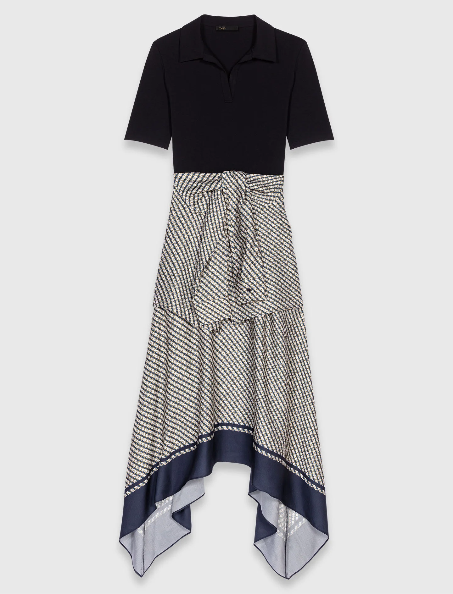 Printed two-tone dress The collection plays with contrasts, featuring hybrid pieces with unexpected volumes and bold prints. This dual-material dress combines a structured polo top and a satin skirt with a bow print, extended by a long-sleeved panel to tie at the front. An originally constructed piece for a look full of character. Pair with strong accessories, like an oversized bag and leather loafers. - Midi-length dual-material dress - Short-sleeved polo with buttoned collar - Satin skirt with asymmetric bow print on the sides - Designed for a standard fit The model is 5' 9 and wears a size 36. Reference: MFPRO04340_L029 Composition & care Main lower material: 100% viscose Main upper material: 92% cotton, 8% elastane Buttons: 100% nacre Hand wash Do not bleach Do not tumble dry Iron at a maximum temperature of 110°C without steam F/ - Professional dry clean, with hydrocarbon solvent, gentle treatment