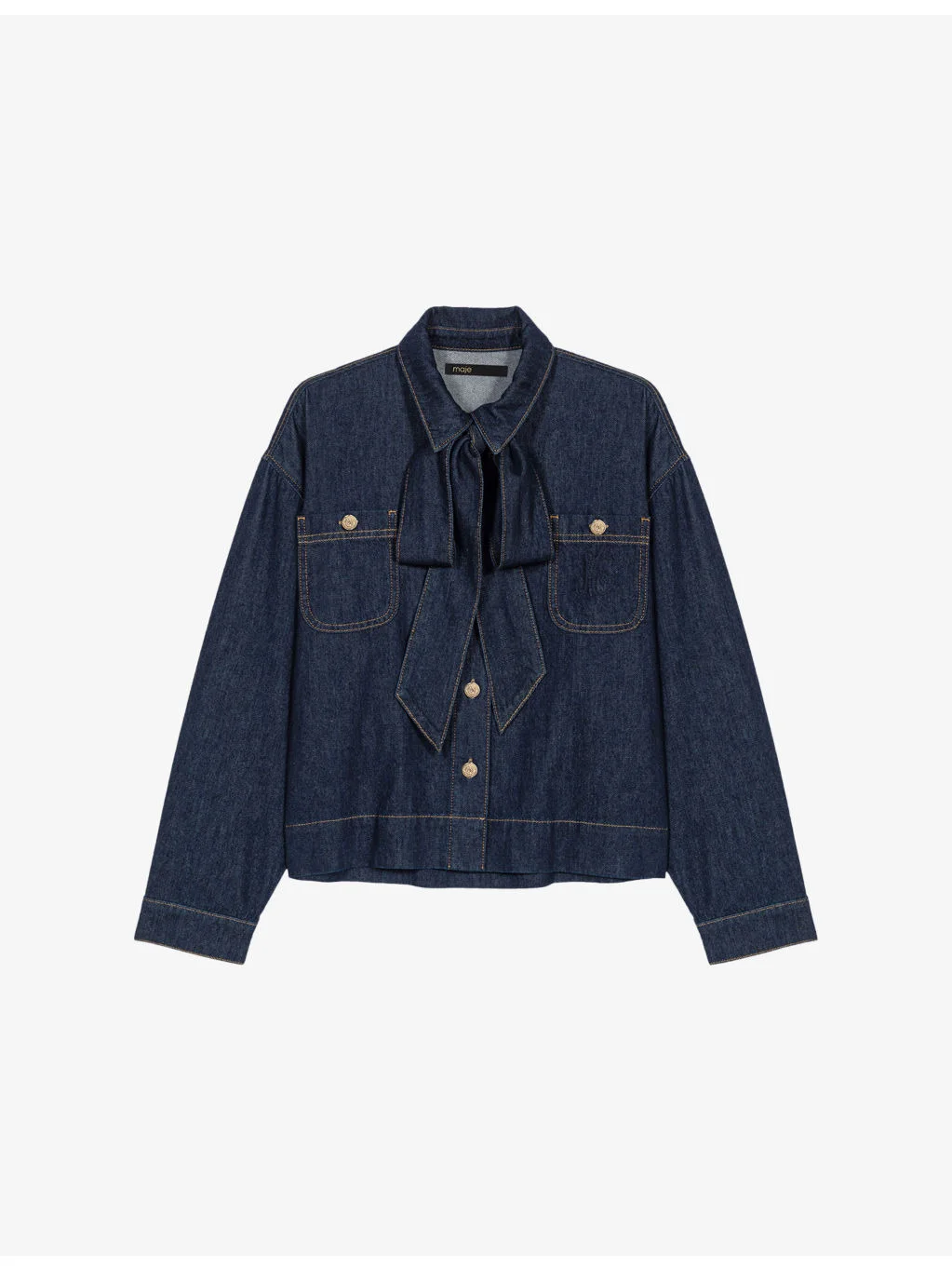 PRODUCT DETAILS - Maje denim shirt - 100% cotton - Pressed stud fastening - Relaxed fit, tie-up lavalliere collar, two patch pockets at the chest, long sleeves, silver-tone hardware - Machine wash at 30°C - True to size - Model is 5ft 10in/1.78m and wears a size UK 8 - Midweight, non-stretch Ref: R04514778