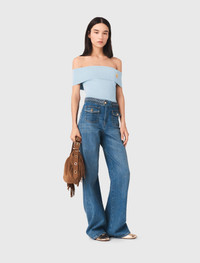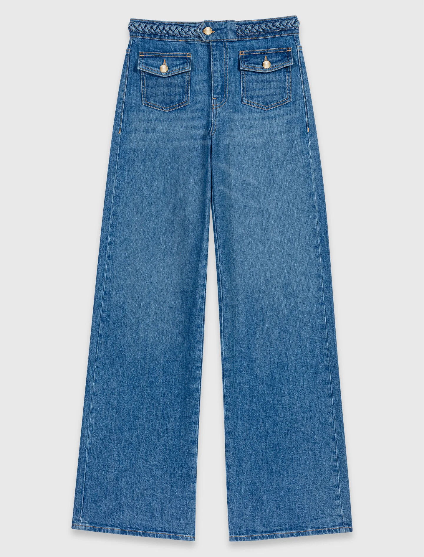 Braided flared jeans A Riviera breeze runs through the collection, where the Maje woman embodies a sun-kissed elegance, making nautical style her own with bold details and a timeless appeal. These flared denim jeans stand out thanks to their tone-on-tone braided belt, which adds texture and character to the waist, enhanced by patch pockets with flaps and textured gold-tone buttons. The ochre topstitching subtly contrasts with the faded blue, while the absence of belt loops highlights the clean lines and couture spirit of this piece with its long, flattering cut. - High-waisted flared denim jeans - Integrated tone-on-tone braided belt - Front flap pockets with gold-tone buttons - Contrasting ochre topstitching - Finish without belt loops The model is 5' 9 and wears a size FR 36. Reference: MFPJE00807_0201 Composition & care Main material: 99% cotton, 1% elastane Regular cycle 30° Do not bleach Do not tumble dry Iron at a maximum temperature of 110°C without steam Do not dry clean