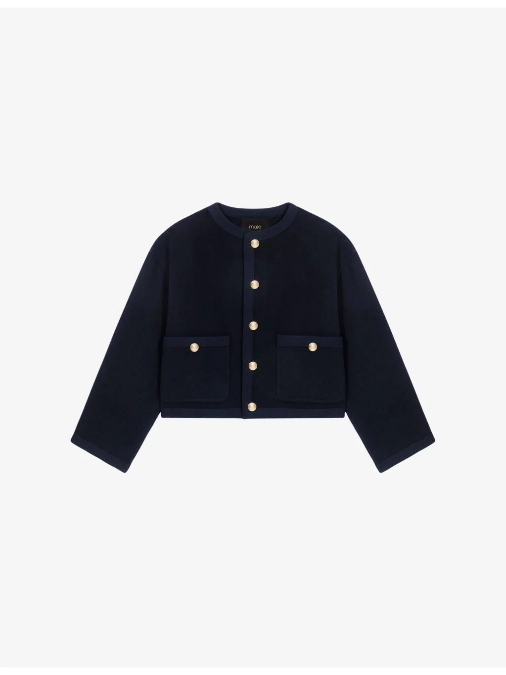 PRODUCT DETAILS - Maje wool-blend jacket - 70% wool, 30% polyester; trim 99% polyester, 1% elastane - Exposed button fastening at front - Relaxed fit, round neck, long sleeves, dropped shoulders, two buttoned patch pockets, braided trims, gold-toned metal buttons, double faced - Dry clean only - True to size - Model is 5ft 9in/1.75m and wears a size UK 8 - Midweight, non-stretch Ref: R04598337