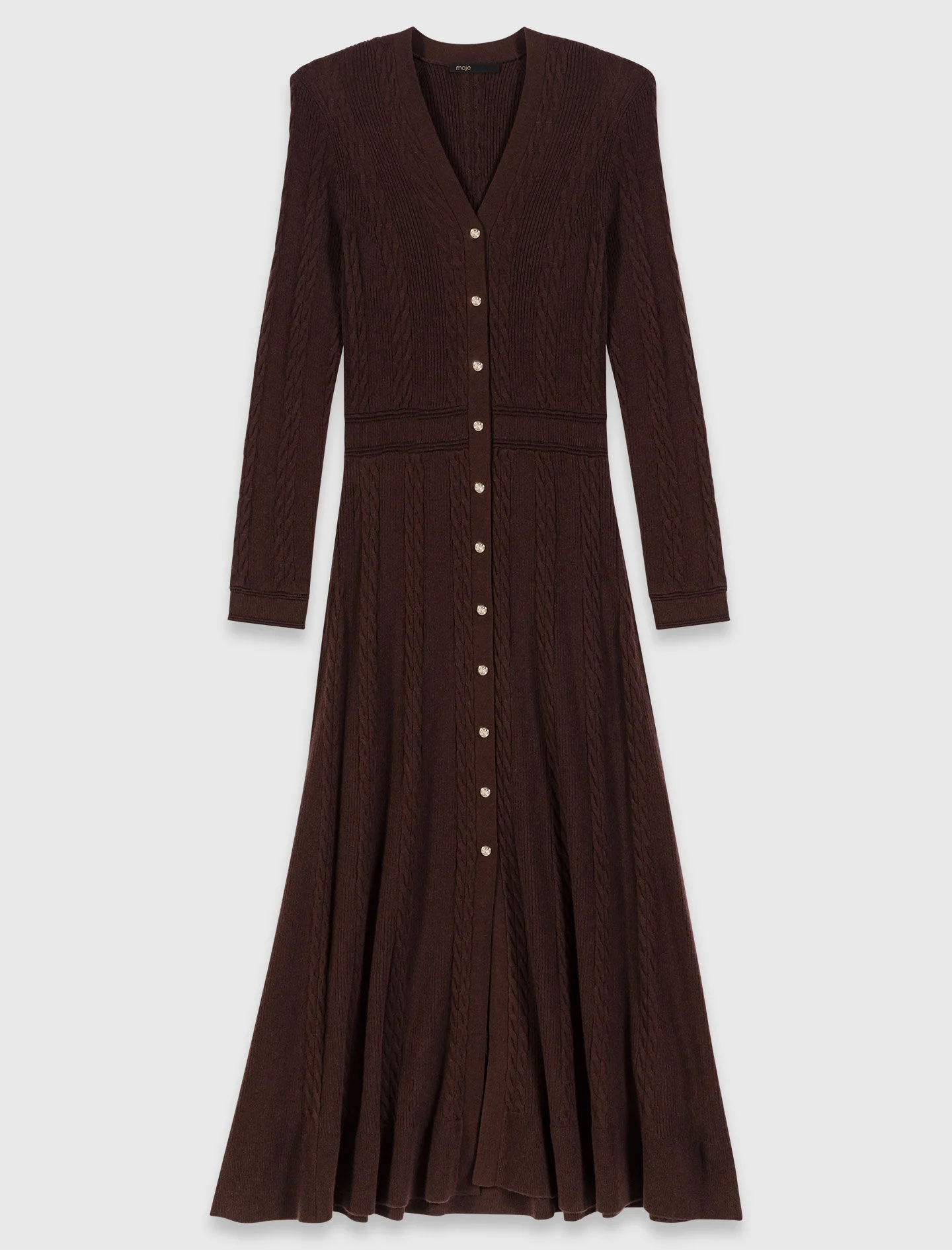 Knit midi dress with buttons A knit dress that strikes the perfect balance between warmth, texture and structure. Knitted from a soft cable knit, it creates a feminine and comfortable silhouette, with its defined waist and flared hem. Gold buttons add a precious touch to the V-neckline, balancing retro simplicity with metropolitan modernity. Wear with a wide belt with a jewelled buckle to accentuate the waist, textured high boots and a fringed bag for a trendy winter look. - Cable-knit maxi dress - Slightly flared at the bottom - Button fastening - Designed for a standard fit The model is 5' 10 and wears a size 36. Reference: MFPRO04453_G005 Composition & care Main material: 36% polyamide, 35% acrylic, 26% wool, 2% elastane, 1% polyester Tab: 39% acrylic, 30% polyamide, 29% wool, 1% elastane, 1% polyester Band: 37% acrylic, 32% polyamide, 28% wool, 2% elastane, 1% polyester Hand wash Do not bleach Do not tumble dry Iron at a maximum temperature of 110°C without steam Do not dry clean