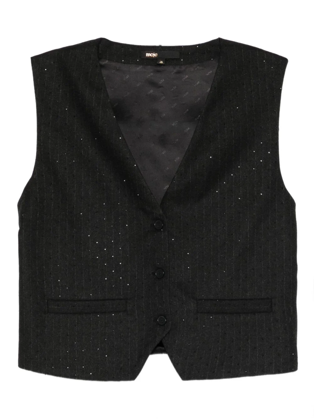 buttoned vest Highlights - Black - Button fastening - Sleeveless - V-neck - Pinstripe pattern Made in France Composition Outer: Polyester 64%, Viscose 34%, Elastane 2% Lining: Viscose 100% Washing instructions Read Manufacturer Guidelines