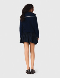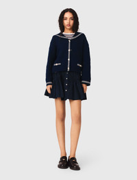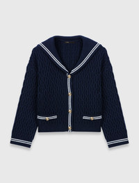 Boat neck cable-knit cardigan This cardigan is inspired by Maje's take on nautical style, where bold marine codes meet Parisian sophistication and freedom of movement. Knitted from pure cable-knit wool, it has a structured drape and provides warmth. The oversized sailor collar with white stripes and the gold jewellery buttons create a timeless look full of character. The striped ribbed finishes and refined faux pockets accentuate the graphic look of this piece. For a distinctly modern look, pair it with a navy blue flared skirt and a striped T-shirt, adding black loafers to complete the outfit. - Cable-knit cardigan with white striped boat neck - 100% wool knit - Gold jewellery buttons with embossed motif - Faux welt pockets accentuated with white stripes - Contrasting ribbed trim - Straight, short, boxy-style cut The model is 5' 9 and wears a size FR 1. Reference: MFPCA00682_0103 Composition & care Main material: 100% wool Rib: 96% wool, 3% polyamide, 1% elastane Hand wash Do not bleach Do not tumble dry Iron at a maximum temperature of 110°C without steam Do not dry clean