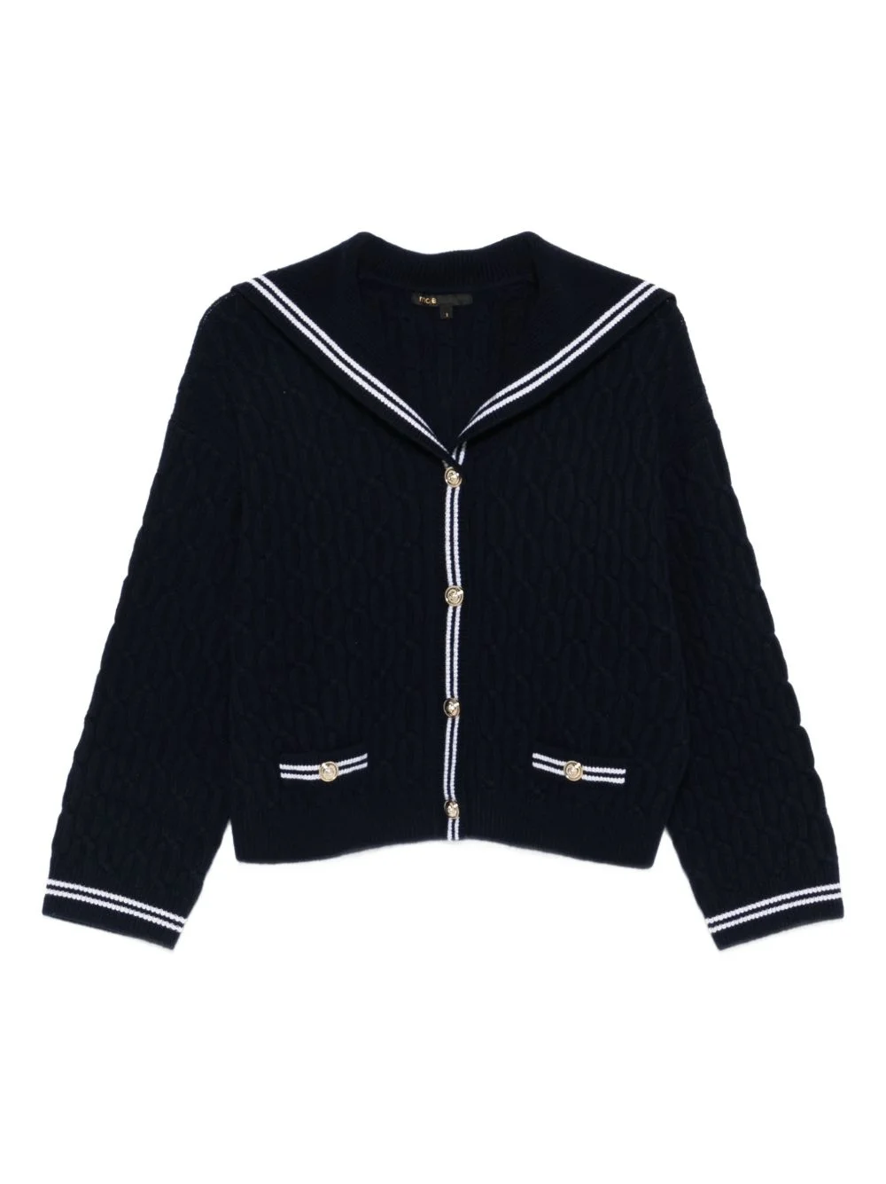 cable-knit sailor-collar cardigan Highlights - Navy blue - Cable knit - Sailor collar - Gold-tone buttons - Ribbed trims Imported Composition Outer: Wool 100% SIZE & FIT Model measurements Height 5 ft 11 in(1.8 m) Bust/Chest 32.28 in(82 cm) Hips 35.82 in(91 cm) Waist 25.19 in(64 cm) Washing instructions Hand Wash