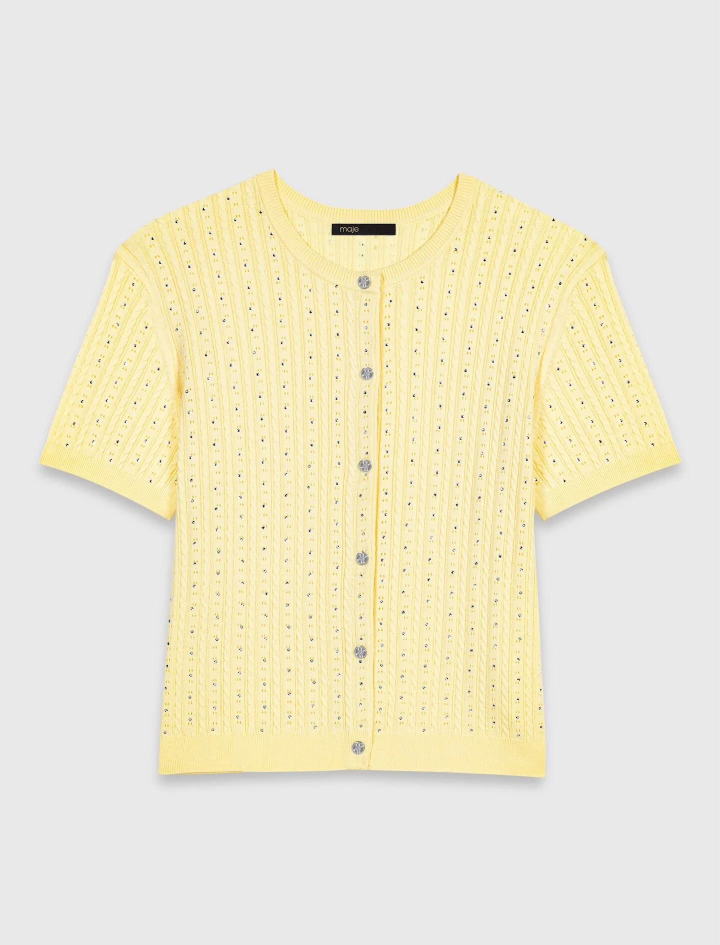 Cardigan with rhinestone neck A Riviera spirit brightens up the silhouette: the light of pastel shades, the sparkle of rhinestones and the freshness of an openwork knit give a modern twist to the summer look. This cropped cardigan in a cotton and silk blend features a delicate knit, alternating cable and openwork for a sophisticated play on textures. Dotted with silver rhinestones and accentuated with metal buttons, it combines refinement and signature details in a radiant soft yellow palette. - Fitted short-sleeved cardigan - Knitted cotton and silk - Alternating cable and openwork bands - Silver rhinestone embellishment - Patterned metal buttons - Rib knit trim Reference: MFPCA00712_0859 Composition & care Main material: 68% cotton, 21% polyamide, 11% silk Tab: 60% cotton, 28% polyamide, 10% silk, 2% elastane Collar: 62% cotton, 26% polyamide, 10% silk, 2% elastane Rib: 56% cotton, 33% polyamide, 9% silk, 2% elastane Hand wash Do not bleach Do not tumble dry Iron at a maximum temperature of 110°C without steam Do not dry clean