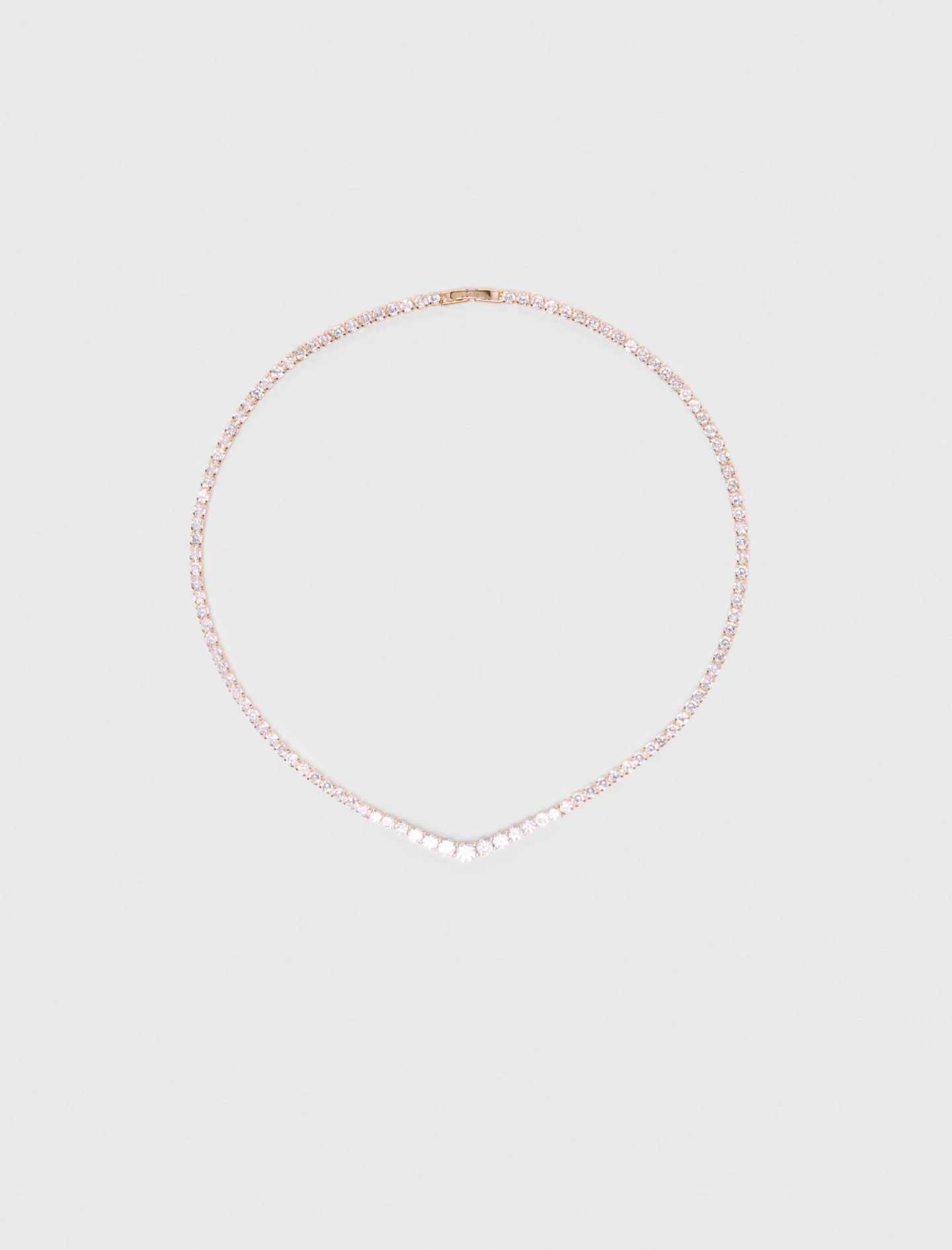 Cascade diamante necklace A touch of audacity makes its way into the collection, embracing refinement down to the most sparkling accessories. This cascading rhinestone necklace shines with graphic elegance. A flexible row of faceted crystal-style stones, set on fine gold-plated brass, drapes in a V-shape at the hollow of the neck, creating a bright, feminine line. The subtle gradation of the stones beautifully accentuates the neckline, while the box clasp secures and completes the piece with a jeweller's precision. - Necklace with a 100% fine gold-plated recycled brass chain - Crystal-style stones - Flexible, articulated setting - Box clasp with a side safety catch - Distinctive central V-shape Reference: MFABI01080 Composition & care Stones: 100% zirconium oxide Chain: 100% brass Do not wash Do not bleach Do not tumble dry Do not iron Do not dry clean