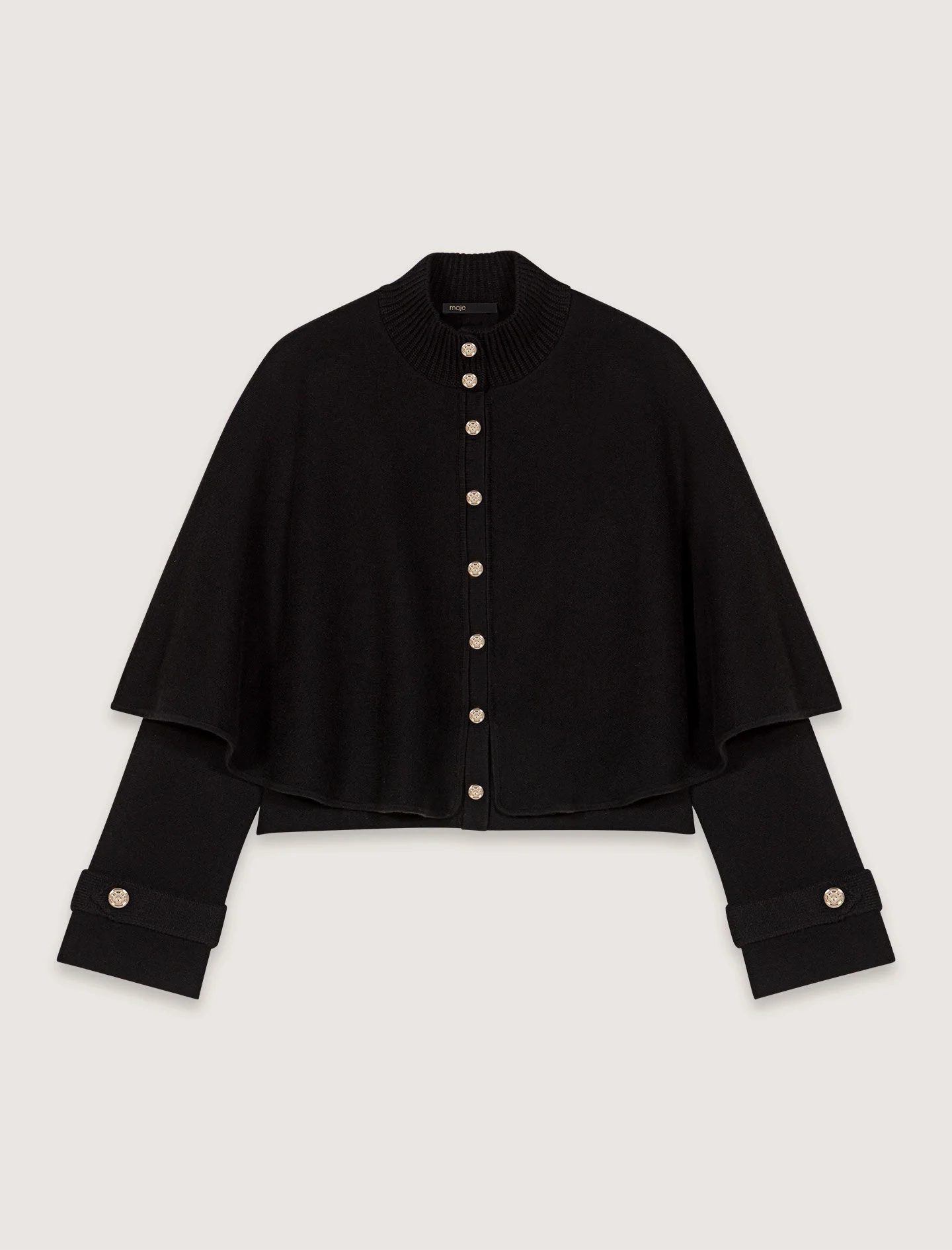 Cape-effect cardigan This blocked-knit cardigan creates a layered effect with its two cape-style panels and buttoned fastening. The long sleeves are accentuated by plackets on the cuffs, with Clover gold buttons. The ribbed, elasticated neck gives this cardigan a sporty edge. Complete your outfit with jeans and mesh ballet flats. - Layered cape-effect cardigan in warp knit - Ribbed neck - 2 panels - Button fastening - Clover gold button cuffs - Designed for a loose fit The model is 5' 9 and wears a size FR 1. Reference: MFPCA00566_2517 Composition & care Main material: 47% polyamide, 30% acrylic, 23% wool Lower sleeve yoke: 38% acrylic, 34% polyamide, 28% wool Rib: 38% acrylic, 35% polyamide, 27% wool Hand wash Do not bleach Do not tumble dry Iron at a maximum temperature of 110°C without steam F - Professional dry clean, with hydrocarbon solvent, normal treatment
