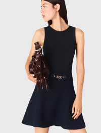 2-in-1 tweed-effect dress An interplay of contrasts and layers enlivens the hybrid silhouettes of the season. Designed to explore multiple styles in one go, this new collection boldly reinterprets wardrobe essentials. Focus on this 2-in-1 dress: a statement piece that combines tailored lines with a removable tweed cape. Wear together for a graphic look or separately, as desired, and accessorise with a belt, boots, and a fringed bag. - 2-in-1 tweed-effect dress - Zip-back tank top - Flared skirt with link tab - Cape with slits and button at the collar - Designed for a standard fit The model is 5' 10 and wears a size 36. Reference: MFPRO04381_0103 Composition & care Main material: 53% polyester, 28% cotton, 18% viscose, 1% elastane Lining: 100% viscose Buckle: 100% polyurethane Secondary material: 95% polyamide, 5% elastane Inner fabric: 100% polyester Do not wash Do not bleach Do not tumble dry Iron at a maximum temperature of 110°C without steam F/ - Professional dry clean, with hydrocarbon solvent, gentle treatment