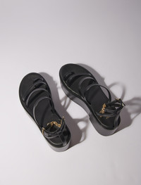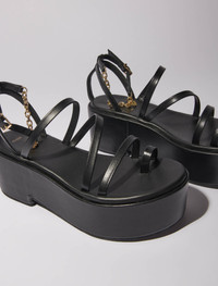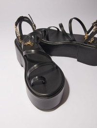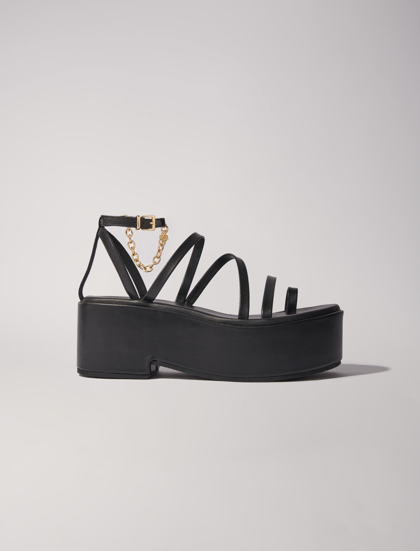 Leather platform sandals For the new collection, the Maje studio has reinvented the season's classic accessories to complement every figure. Made from leather, these sandals play on volume to give your silhouette a new twist this season. For a bold mix of elegance and boldness, they feature a curved wedge platform that gives the illusion of a heel, and slender straps. And what makes it so chic? An adjustable buckle, embellished with a gold chain, discreetly accentuates the ankle. - Strappy sandals - Gold chain - Platform height: 7cm Reference: MFACH00664_2517 Composition & care Lining: sheepskin Outer sole: 100% polyurethane Upper: sheepskin Sock lining: sheepskin Buckle: 95% zinc, 5% copper Chain: 85% copper, 15% zinc Do not wash Do not bleach Do not tumble dry Do not iron Do not dry clean