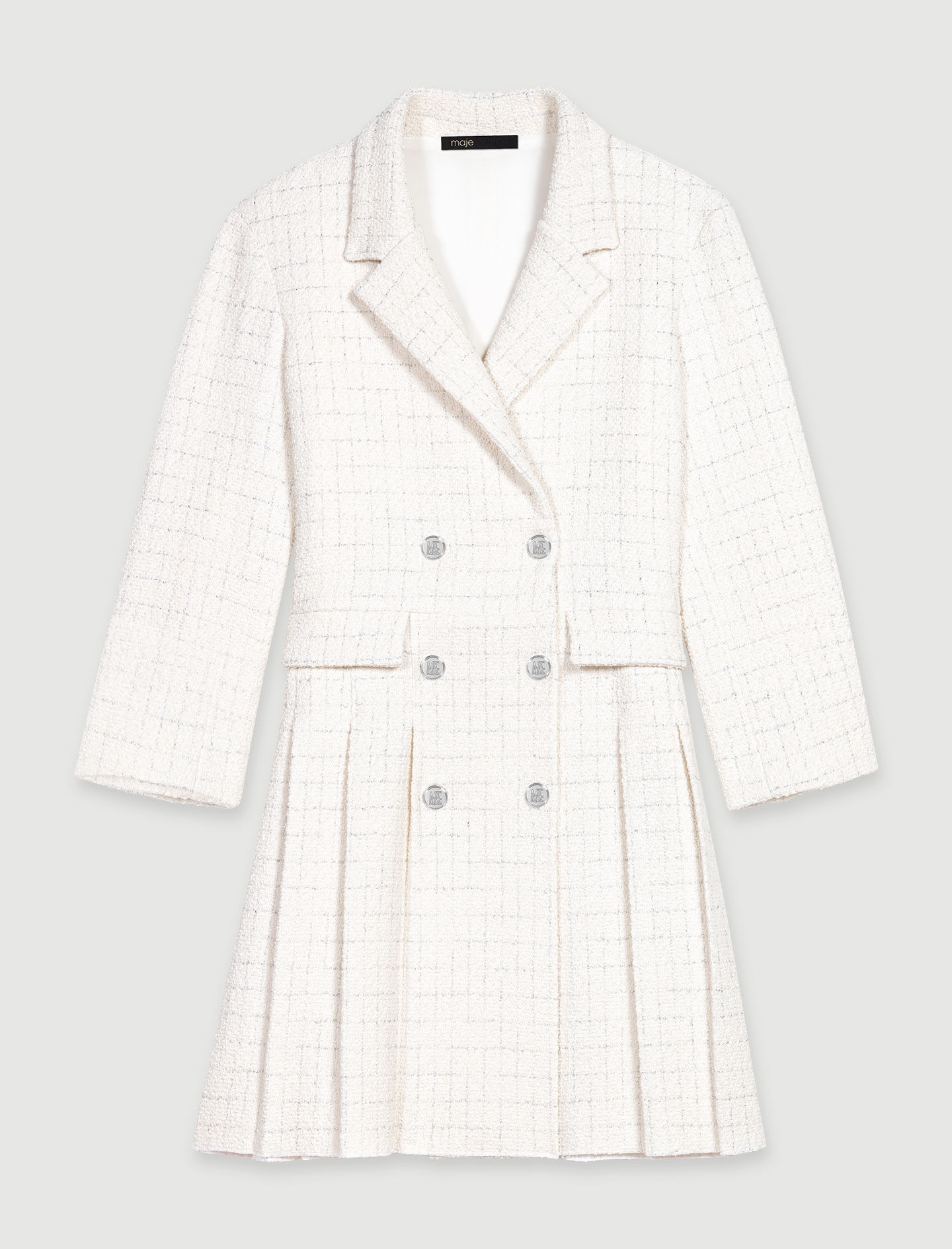 Short button-up dress With lightweight materials, feminine details and pastel shades, the Maje studio has reinvented timeless pieces to create the perfect day or evening wear. With its smart tailoring and impeccable fit, this short dress creates an elegant, alluring look. Featuring a lapel collar and 3/4-length sleeves, it has a double-breasted design, two flap pockets and a pleated-effect skirt. Designed for daytime or office wear, accentuate your look with a bag and platform sandals. - Short dress - Button fastening - Pleated skirt The model is 5' 10 and wears a size 36. Reference: MFPRO03449_0101 Composition & care Main fabric: 57% cotton, 22% polyester, 16% acrylic, 3% other fibres, 1% metalized fibers, 1% elastane Underside fabric: 100% polyester Upper lining: 94% polyester, 6% elastane Do not wash Do not bleach Do not tumble dry Iron at a maximum temperature of 110°C without steam F/ - Professional dry clean, with hydrocarbon solvent, gentle treatment