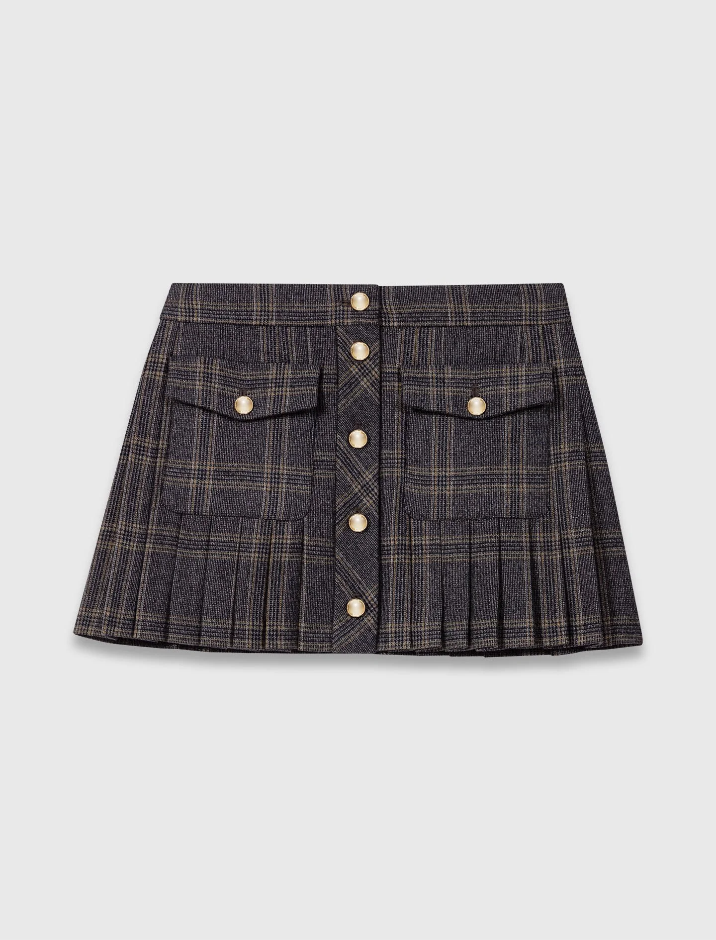 Short pleated checked skirt As a nod to schoolgirl silhouettes, Maje gives the college style a modern twist for this new season. This pleated checked skirt is a must-have for a preppy chic wardrobe. Its flap pockets and gold buttons create a look that is both structured and feminine, to be paired with a matching jacket or oversized knitwear to play with contrasts. Add a pair of loafers and socks to complete the look. - Short pleated checked skirt - Gold buttons on the front - Buttoned flap pockets - Designed for a tailored fit The model is 5' 11 and wears a size 36. Reference: MFPJU01512_0505 Composition & care Main material: 41% polyester, 23% acrylic, 17% wool, 14% viscose, 3% elastane, 2% polyamide Lining: 100% viscose Inner fabric: 100% polyester Do not wash Do not bleach Do not tumble dry Iron at a maximum temperature of 110°C without steam F/ - Professional dry clean, with hydrocarbon solvent, gentle treatment