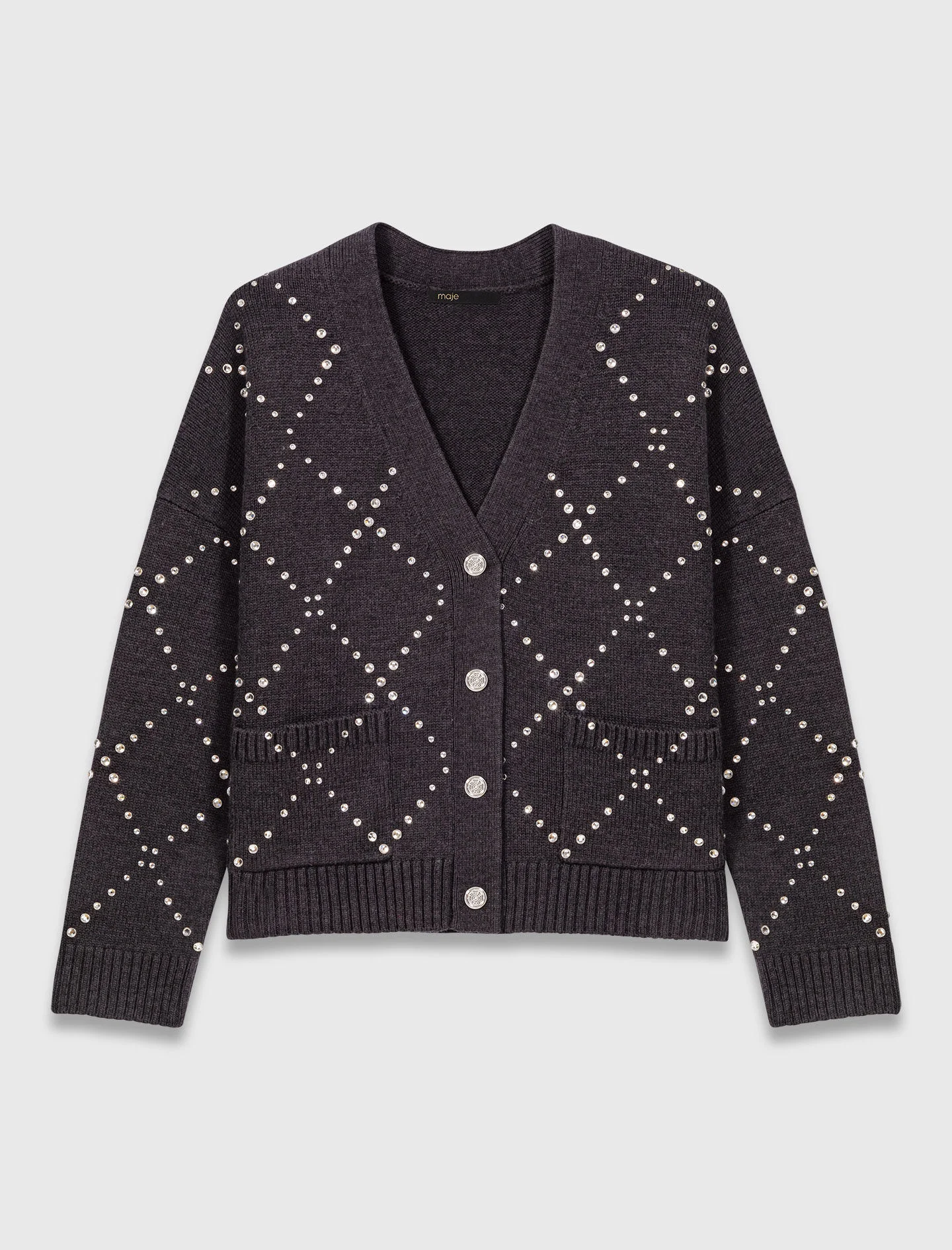 Rhinestone check cardigan This season, Maje is reinventing the wardrobe by playing with contrasts. A comforting knit with sparkling details: this oversized cardigan features a bright rhinestone check pattern for a look that is both cosy and assertive. Wear it with wide-leg black jeans, and add statement accessories, like loafers and an oversized leather bag. - Oversized cardigan with rhinestone check pattern - Front button fastening - Two patch pockets - Designed for a cropped, boxy fit The model is 5' 10 and wears a size 1. Reference: MFPCA00648_0505 Composition & care Main material: 50% acrylic, 46% wool, 4% polyamide Tab: 49% acrylic, 46% wool, 5% polyamide Hand wash Do not bleach Do not tumble dry Iron at a maximum temperature of 110°C without steam Do not dry clean