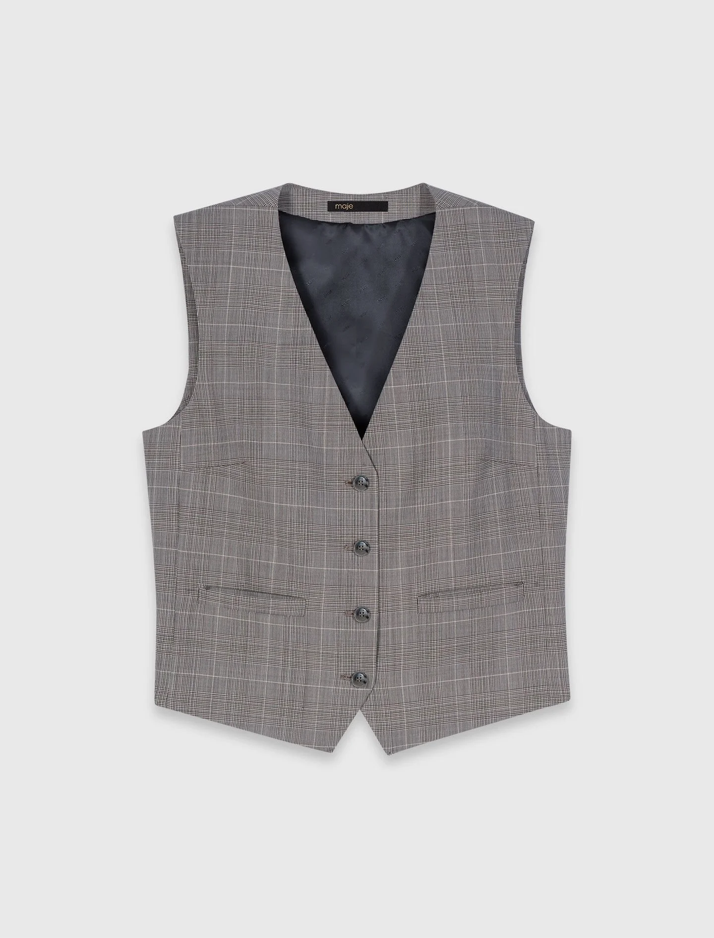 Checked tailored jacket A return to confident urban elegance, where graphic lines and fine materials take centre stage to reinvent everyday wear. This short, sleeveless tailored waistcoat, made from wool, has a fitted cut enhanced by a V-neckline, welt pockets and a pointed hem for a structured, refined look. For a resolutely modern silhouette, pair it with high-waisted jeans, a gold chain belt and a fringed clutch. - Wool tailored waistcoat - Deep V-neckline - Four-button marbled fastening - Two welt pockets at the waist The model is 5' 10 and wears a size FR 36. Reference: MFPTO01315_0505 Composition & care Main fabric: 50% wool, 43% polyester, 5% elastane, 2% viscose Lining: 100% viscose Buckle: 100% brass Do not wash Do not bleach Do not tumble dry Iron at a maximum temperature of 110°C without steam F/ - Professional dry clean, with hydrocarbon solvent, gentle treatment