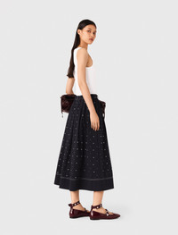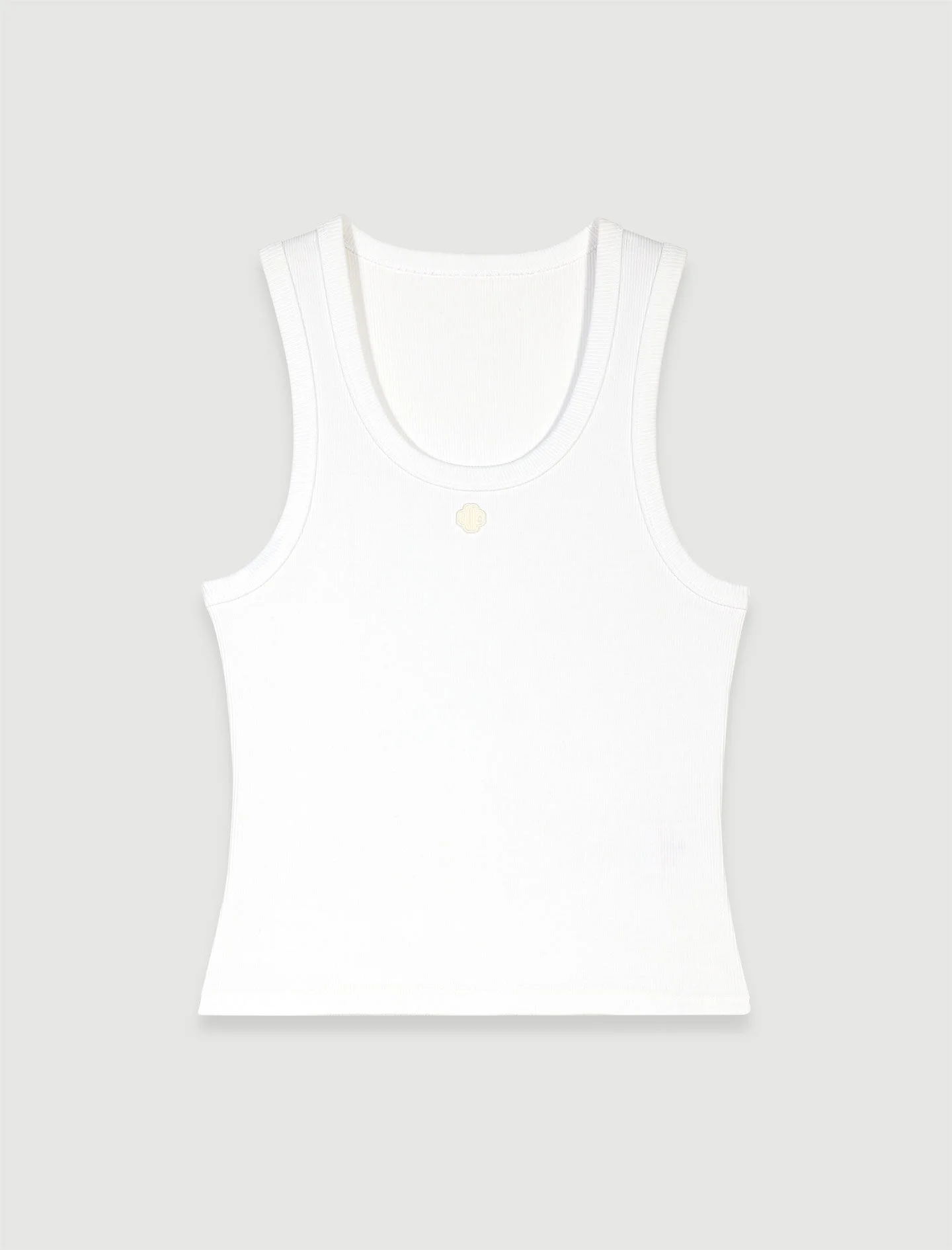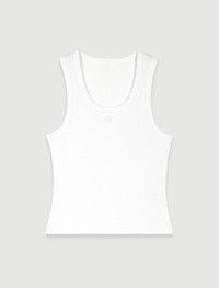 Rib knit tank top Inspired by a distinctly British wardrobe, the studio boldly and stylishly reinterprets women's wardrobe essentials. This season's star piece, the classic ribbed knit tank top, has been updated with sexy details to give your everyday silhouettes a new spin. Featuring wide straps and a round neckline, it also has a tone-on-tone Clover patch. Inspired by the elegance of the '90s, it can be worn on its own or layered with shirts for mid-season. Ideal for casual or office wear, mix and match it with suit trousers accentuated with a belt. When it comes to accessories, opt for a cap, bag and ballet flats embellished with studs. - Rib knit tank top - Clover Patch - Wide shoulder straps The model is 5' 10 and wears a size 36. Reference: MFPTS00872_10 Composition & care Main material: 98% cotton, 2% elastane Embroidery: 100% polyester Gentle cycle 30° Do not bleach Do not tumble dry Iron at a maximum temperature of 110°C without steam Do not dry clean