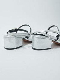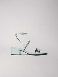 Leather strappy sandals For the new collection, the Maje studio has reinvented the season's classic accessories to complement every figure. Made from silver metallic leather, these heeled sandals are a dazzling addition to any day or evening wear. Thin, elegant, adjustable straps twine around the ankle, and an oversize strap features a signature Clover logo in gold. Ideal for all occasions, they'll add a touch of sophistication to your silhouette, and can be mixed and matched with all your styles. - Silver leather heeled sandals - Adjustable straps - Gold Clover logo Reference: MFACH00650_0500 Composition & care Lining: sheepskin Outer sole: cow Upper: cow Sock lining: sheepskin Buckle: 100% zinc Applique: 100% rubber Jewellery: 95% zinc, 5% copper Do not wash Do not bleach Do not tumble dry Do not iron Do not dry clean