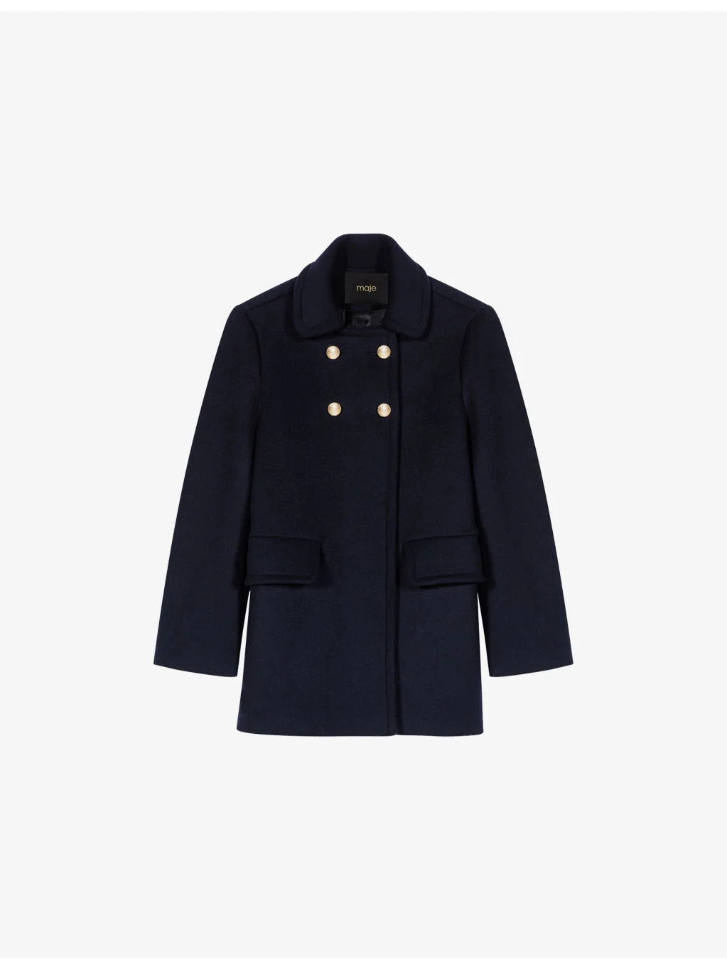 PRODUCT DETAILS - Maje wool-blend coat - 79% wool, 21% polyamide - Exposed button fastening at front - Regular fit, collared, long sleeves, two pockets at the side, gold-tone hardware - Dry clean - True to size - Midweight, non-stretch Ref: R04578824