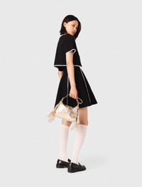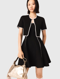 Topstitched cropped cardigan Back to metropolitan energy: a structured, graphic cropped cardigan is a must-have, ideal for rewriting the rules of a city wardrobe. This piece plays on contrasts with its white scalloped trim accentuating every edge, its short sleeves and its cropped fit. Wear it open or closed for an assertive, contemporary look. Wear it over the matching black dress, add a mini Miss M bag and loafers for a sophisticated monochrome silhouette, with a twist of bright details. - Cropped black knit cardigan - Contrasting white scalloped trim - 3 hook-and-eye fastenings - Short sleeves - Fine, tight knit The model is 5' 10 and wears a size FR 1. Reference: MFPCA00685_2517 Composition & care Main material: 82% polyester, 16% polyamide, 2% elastane Embroidery: 70% viscose, 30% polyester Hand wash Do not bleach Do not tumble dry Iron at a maximum temperature of 110°C without steam F - Professional dry clean, with hydrocarbon solvent, normal treatment