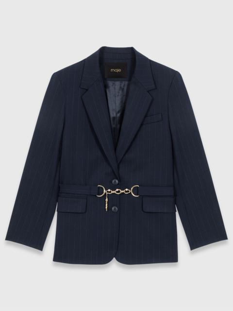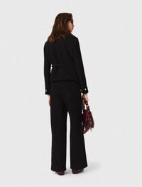 Long tweed jacket The Maje seasonal wardrobe reveals structured pieces with enveloping materials and impeccable cuts. This black jacket revisits the tailored look with a retro-modern touch. The velvet details accentuate the lines of the silhouette, and the removable belt elegantly defines the waist. To complete the look, pair it with the matching trousers and add a signature bag and patent ballet flats for a feminine silhouette. - Belted jacket at the waist with velvet details - Removable belt - Long sleeves with split cuffs - Gold button fastening and 4 flap pockets - Designed for a boxy fit The model is 5' 10 and wears a size 36. Reference: MFPVE00751_2517 Composition & care Main material: 45% polyester, 41% cotton, 11% acrylic, 2% polyamide, 1% elastane Lining: 100% viscose Braid: 95% polyester, 5% elastane Facing: 93% polyester, 7% elastane Do not wash Do not bleach Do not tumble dry Iron at a maximum temperature of 110°C without steam F/ - Professional dry clean, with hydrocarbon solvent, gentle treatment