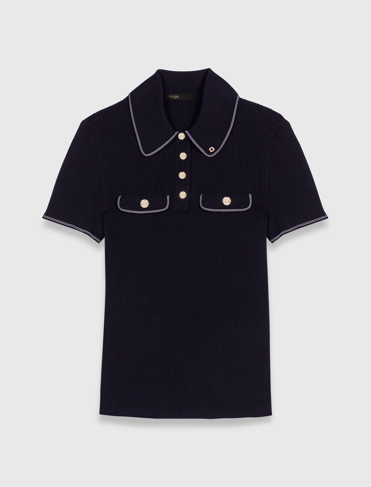 Short-sleeve polo shirt This metropolitan collection arrives with modern elegance, perfect for transitioning between seasons with pieces that are both comfortable and bold. This short-sleeved rib knit polo stands out as a versatile and contemporary piece to have in your wardrobe. The buttoned collar, adorned with a discreet Clover detail, adds a refined touch. The flap chest pockets and short sleeves make it an everyday essential, easy to pair with a leather skirt or tailored trousers. Wear it with leather loafers and a designer handbag for a modern and elegant look. - Short-sleeved rib knit jumper - Buttoned collar with Clover detail - Flap chest pockets The model is 5' 10 and wears a size 1. Reference: MFPPU00915_0103 Composition & care Main material: 56% viscose, 42% polyamide, 2% elastane Rib: 60% viscose, 39% polyamide, 1% elastane Hand wash Do not bleach Do not tumble dry Iron at a maximum temperature of 110°C without steam Do not dry clean