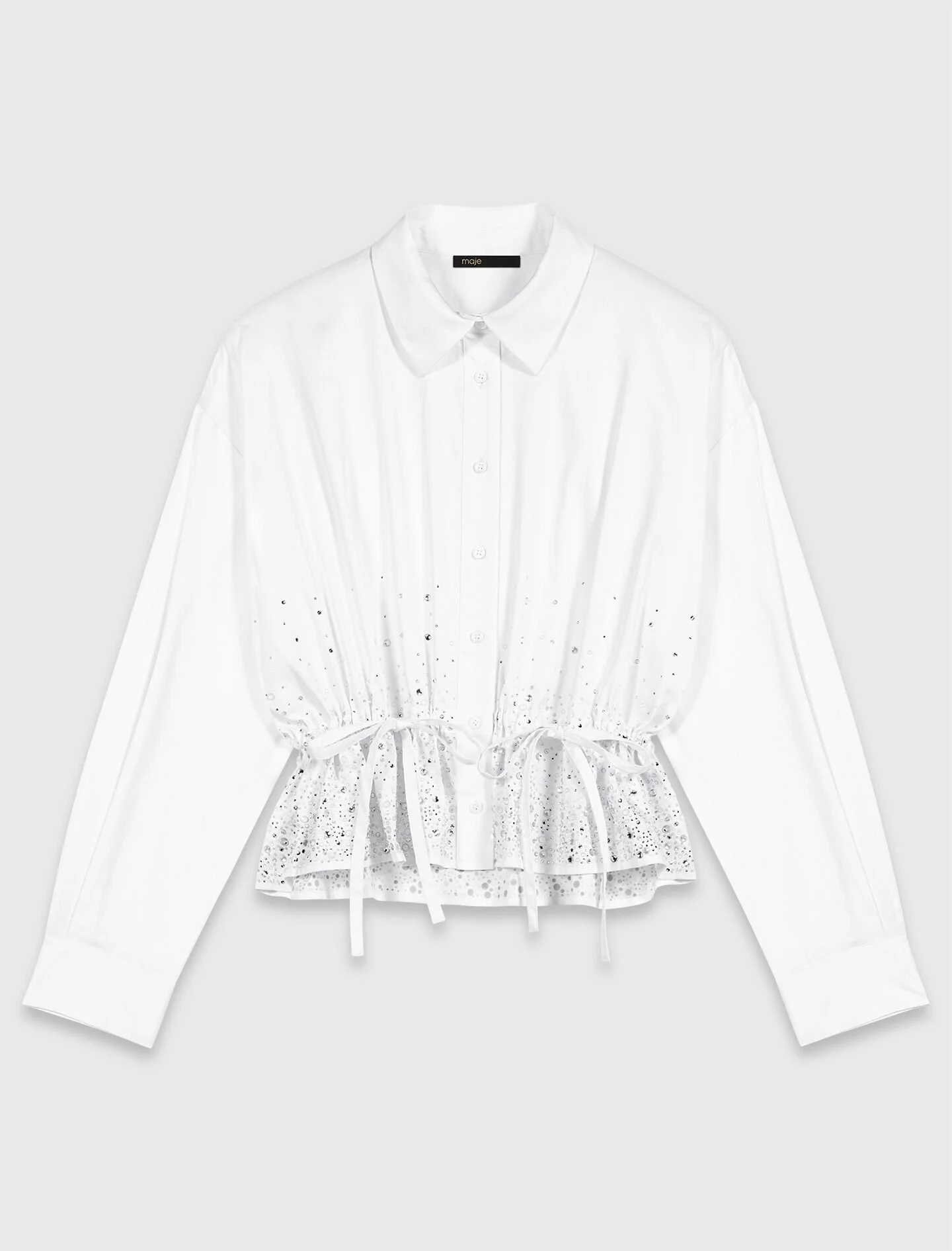 Cotton shirt with rhinestones The Maje woman asserts herself, drawing her energy from the light and freedom of a summer on the Riviera, where every detail expresses boldness and femininity. This cotton blouse captivates with its interplay of textures: a simple upper section is highlighted by a densely embellished water-drop gradient rhinestone pattern for a graphic, luminous effect. The adjustable waist enhances the silhouette, while the precise finishing touches and peplum cut ensure a sophisticated and unique look. - Cotton blouse embellished with silver rhinestones - Fitted silhouette with drawstring waist - Water drop gradient rhinestone pattern - Button fastening at the front - Full long sleeves Reference: MFPCM00767_10 Composition & care Main material: 100% cotton Regular cycle 30° Do not bleach Do not tumble dry Iron at a maximum temperature of 110°C without steam Do not dry clean