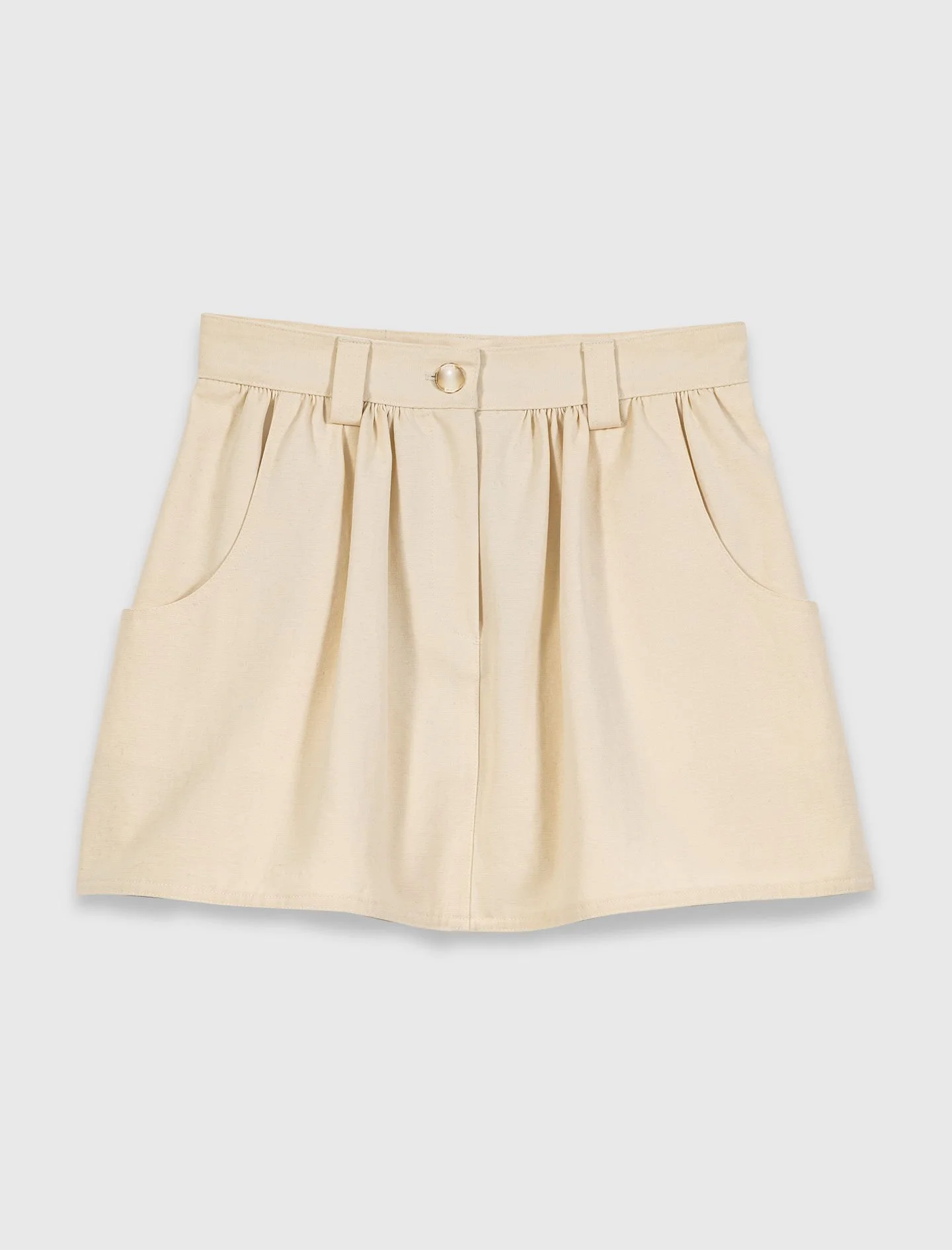 Cotton skort Evoking a chic summer where natural style meets sophisticated details, the Maje woman asserts herself with a blend of urban nonchalance and sun-kissed allure. This pure cotton skort has an A-line silhouette structured by gathers under the waist, two rounded pockets and a gold-tone jewellery button with a pearly sheen. The subtle canvas texture and matte finish make for a distinctly elegant and radiant piece. - Layered-effect cotton skort - Round gold-tone button with a mother-of-pearl centre - Short A-line cut - Gathers under the waistband - Two front pockets - True to size - European summer outfit The model is 5' 9 and wears a size FR 36. Reference: MFPSH00762_0101 Composition & care Main material: 100% cotton Pocket lining: 100% cotton Regular cycle 30° Do not bleach Do not tumble dry Iron at a maximum temperature of 110°C without steam F/ - Professional dry clean, with hydrocarbon solvent, gentle treatment