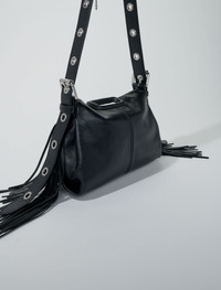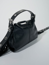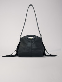 Crackle leather mini Miss M bag The latest addition to Maje's collection, Miss M is a real fashion statement. Judith Milgrom has designed a generation's It bag with the hallmarks of the classic M — rectangular leather handles, fringing and detailed topstitching. It has the cool Maje look and is designed to be a versatile accessory, coming in two sizes and a variety of fabrics and colours. Thanks to the long adjustable eyelet strap, create a variety of styles! Carry it by hand for a casual look; short or longer on your shoulder for a classic touch. Or wear it cross-body for a stylish urban vibe. The Miss M stands out for its generous bold buckles at each end of the handles and subtle piercing allowing for endless charm personalisation. This mini crackle leather version is compact with room for your essentials and comes in white with blueish fringing. - Mini bag with eyelet strap - 4 carrying options - Dimensions: 22 x 13 x 11 cm and strap: 115 cm - 1 interior patch pocket and flap fastening - Blueish fringing Reference: MFASA01059 Composition & care Lining: 100% polyester Leather: cow Do not wash Do not bleach Do not tumble dry Do not iron Do not dry clean