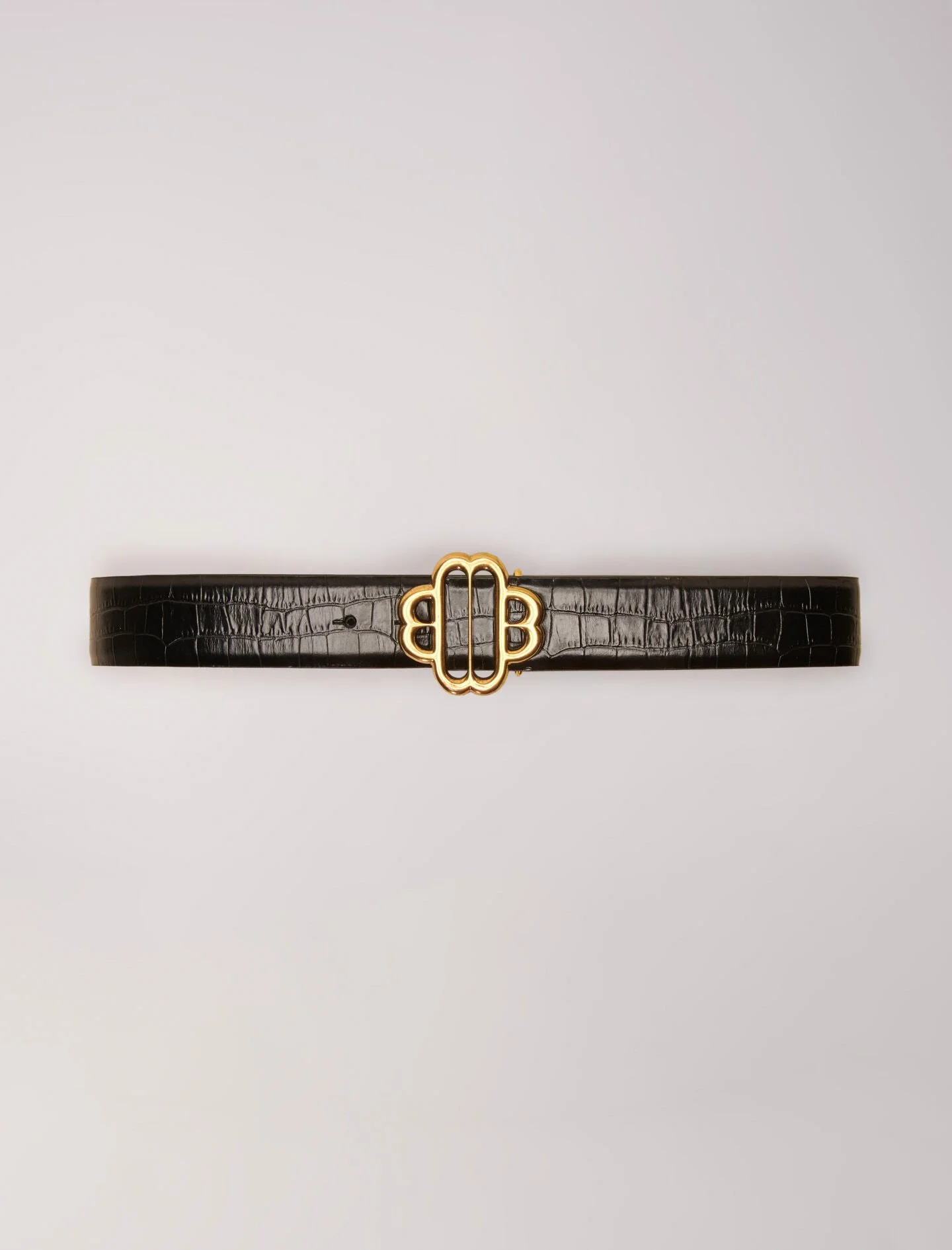 Croc-effect leather double M belt Crocodile-effect embossed leather belt available in black and cognac. Double M logo clasp. - Width: 3 cm - 7 three settings 2.5 cm - Golden Brass Aged Effect - Embossed black crocodile leather and cognac - Double M Reference: MFACE00297_2517 Composition & care Lining: 91% polyester, 9% viscose Coating: 100% polyurethane Leather: cow Do not wash Do not bleach Do not tumble dry Do not iron Do not dry clean