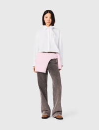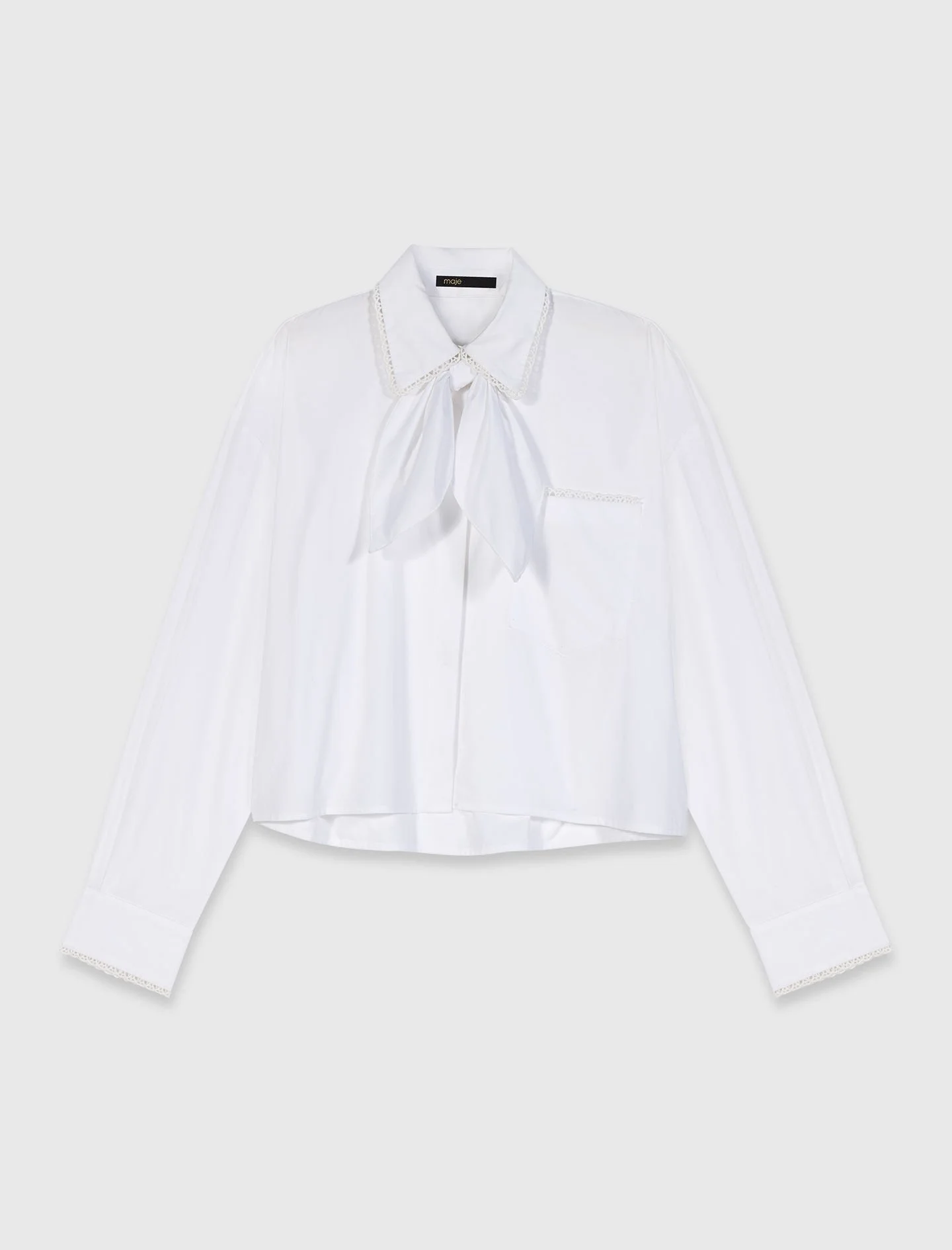 Crochet collar shirt With an urban, preppy feel, the Chinese New Year capsule collection offers a wardrobe where an interplay of contrasts and delicate details adds sophistication and character. This cropped cotton poplin shirt has an appealing structured silhouette. An openwork lace trim on the cuffs, pocket and collar, which is itself enhanced by a removable tie-neck, offers elegant monochrome finishes. For a bold look, pair it with grey flared jeans, with a colourful jumper tied at the waist to add definition, and suede loafers. - Cotton poplin shirt with croquet collar - Removable matching tie-neck - Openwork lace trim on the collar, cuffs and pocket - Short, boxy and loose fit - Mother-of-pearl buttons under a concealed placket The model is 5' 10 and wears a size FR 1. Reference: MFPCM00719_10 Composition & care Main material: 100% cotton Braid: 100% polyester Buttons: 100% nacre Regular cycle 30° Do not bleach Do not tumble dry Iron at a maximum temperature of 110°C without steam F/ - Professional dry clean, with hydrocarbon solvent, gentle treatment