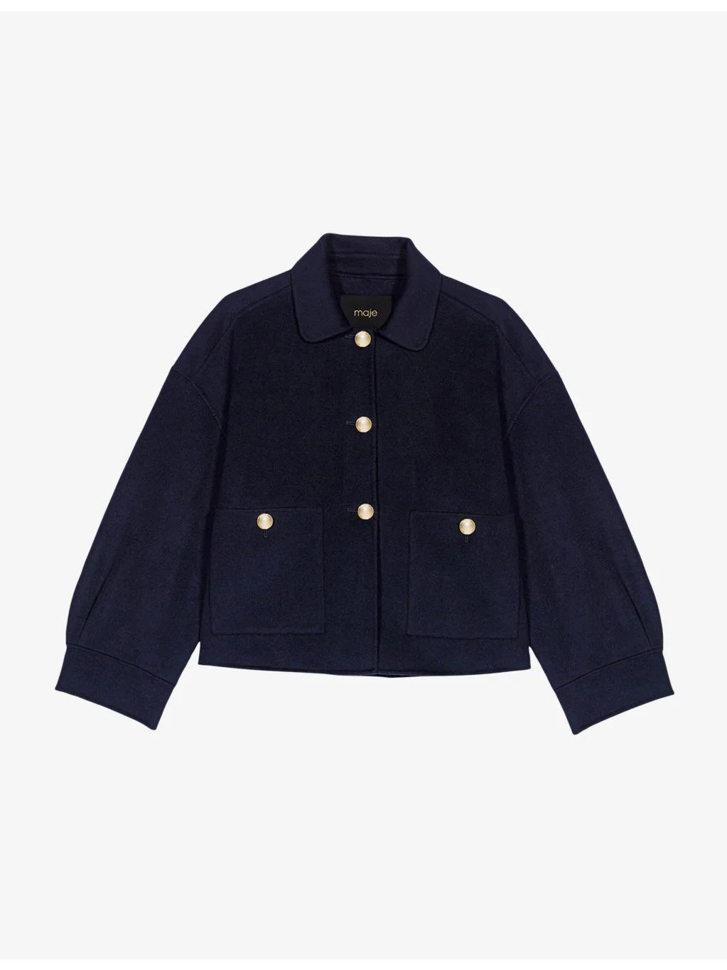 PRODUCT DETAILS - Maje wool-blend jacket - 68% wool, 26% polyester, 5% polyamide, 1% acrylic - Exposed button fastening at front - Cropped, classic collar, round neck, long sleeves, two pockets at the side, gold-tone hardware - Dry clean - True to size - Model is 5ft 10in/1.78m and wears a size UK 8 - Midweight, non-stretch Ref: R04522372